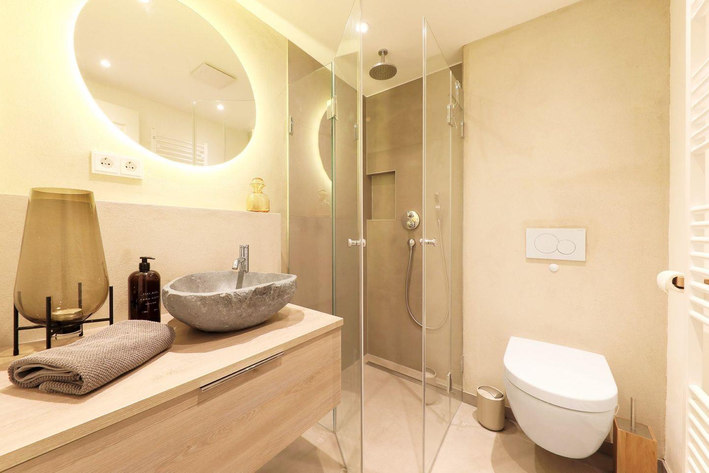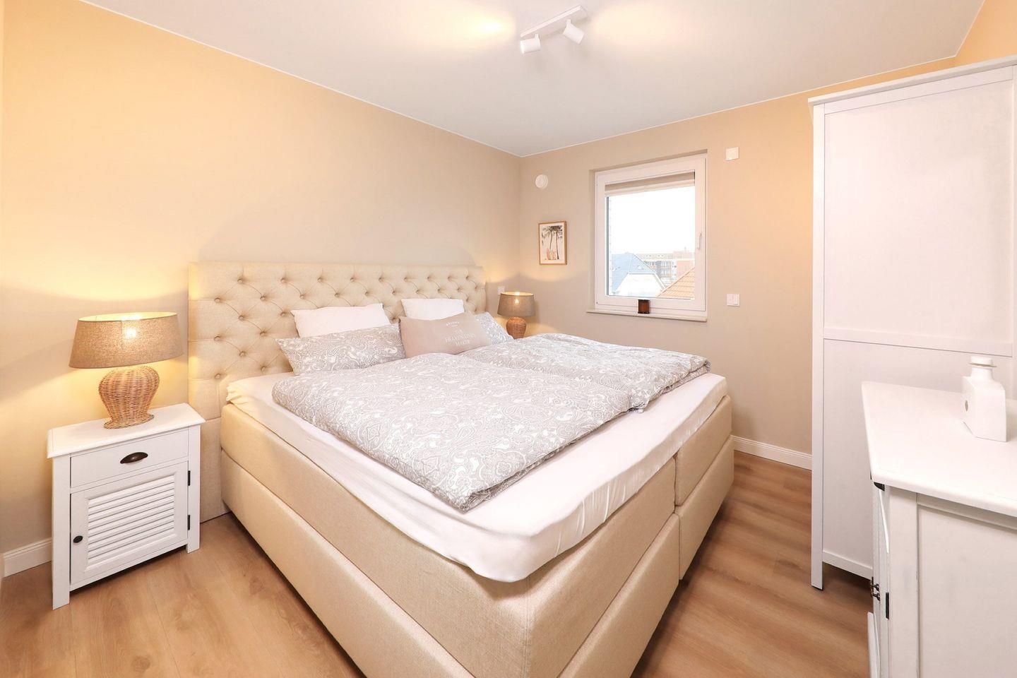 Auf gleicher Ebene befindet sich das Schlafzimmer mit Doppel-Boxspringbett. Direkt nebenan befindet sich ein modernes Badezimmer mit großer Dusche, Waschtisch und WC.