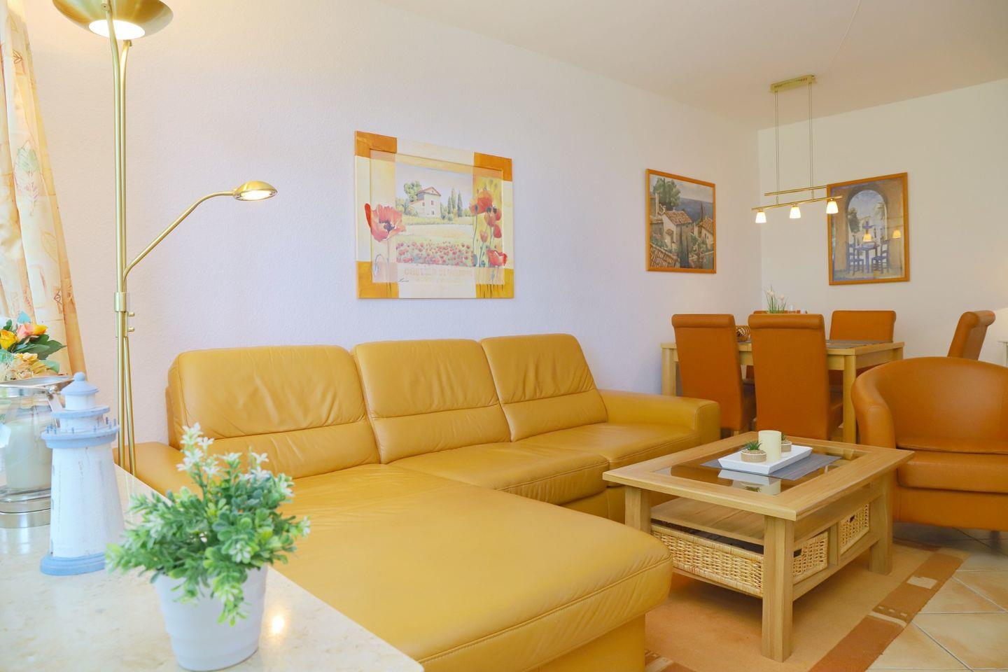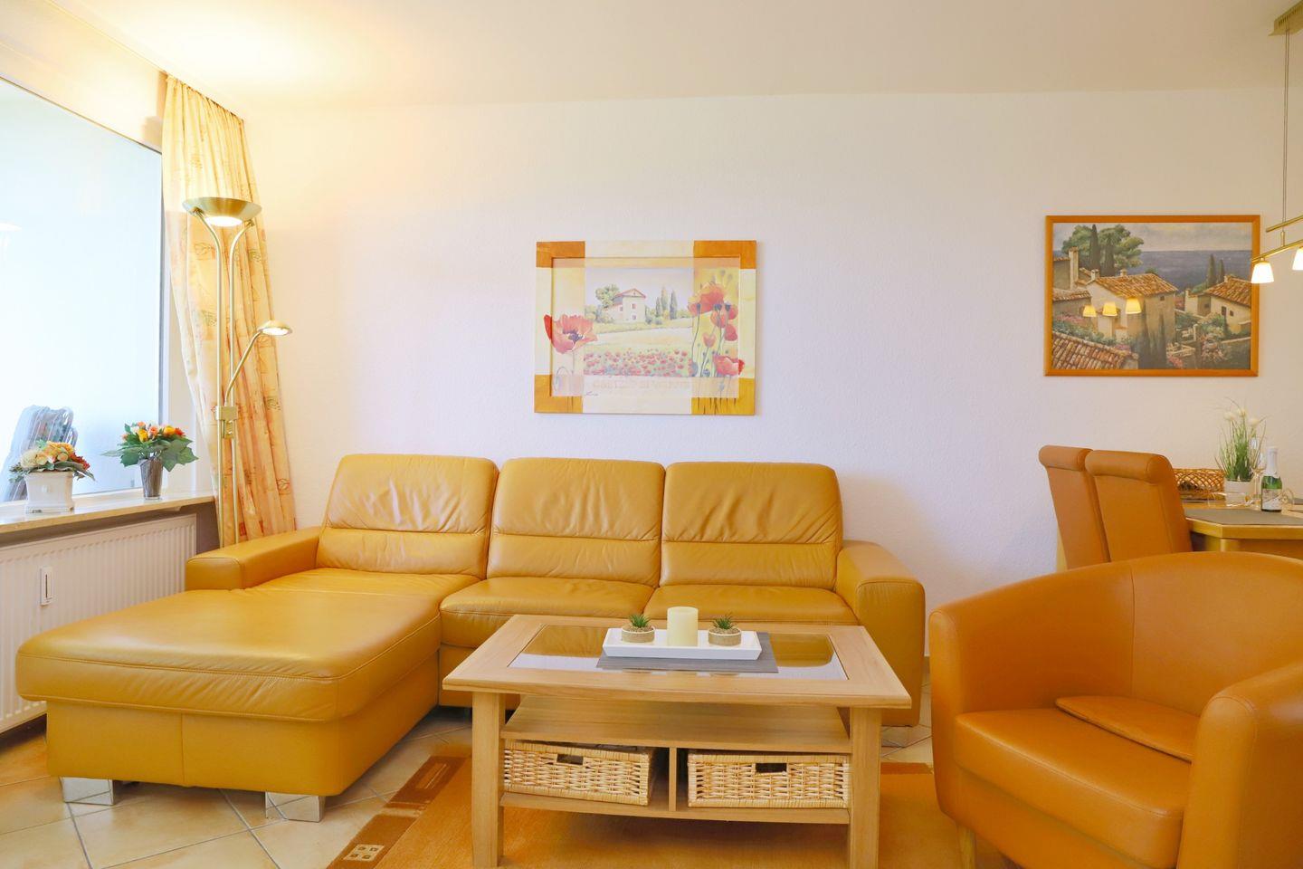 Im nach Süd/ Westen ausgerichteten Wohnraum laden eine moderne Ledercouchgarnitur mit Récamiere und ein passender Sessel zum Entspannen ein. Flat-TV mit DVD-Player und Radio mit CD Fach sind selbstverständlich. WLAN ist kostenlos vorhanden.