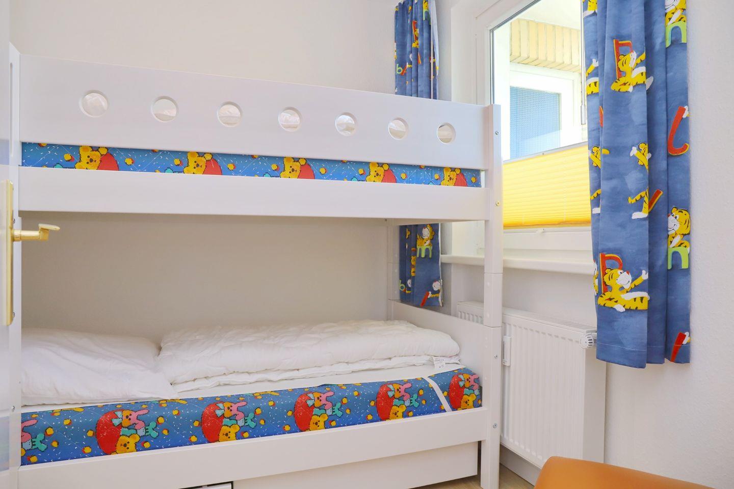 Von der Diele im Eingangsbereich kommen Sie in das zweite Schlafzimmer mit Etagenbett (90x200 cm) und Kleiderschrank. Auch hier ist ein Verdunkelungsrollo am Fenster.