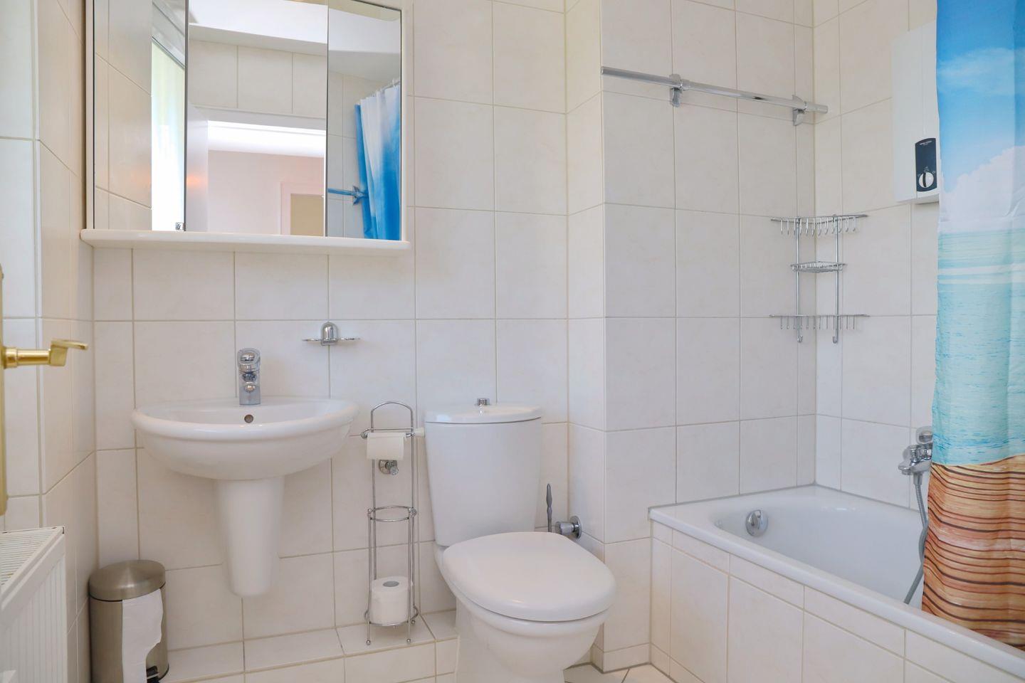 Gegenüber finden Sie das helle Tageslicht Badezimmer vor, dies ist ausgestattet mit einer Badewanne mit einer Duschvorrichtung, einem Waschbecken mit Spiegelschrank und WC.