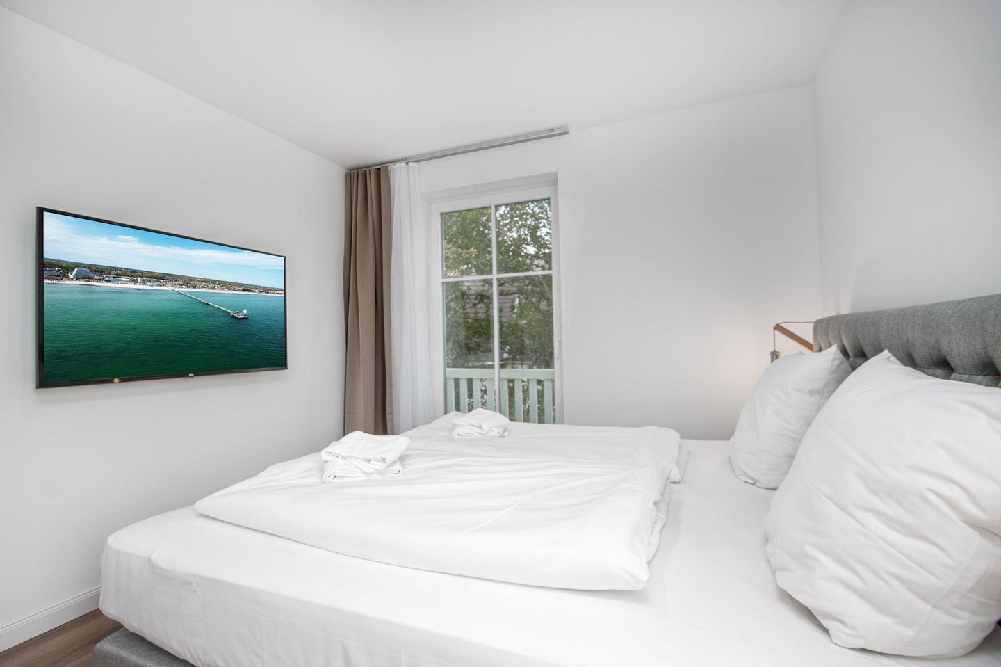 Das Schlafzimmer erwartet Sie mit einem luxuriösen Boxspringbett (180x200 cm Liegefläche), einem geräumigen Kleiderschrank, einem Smart-TV und Verdunkelungsgardinen für einen erholsamen Schlaf.