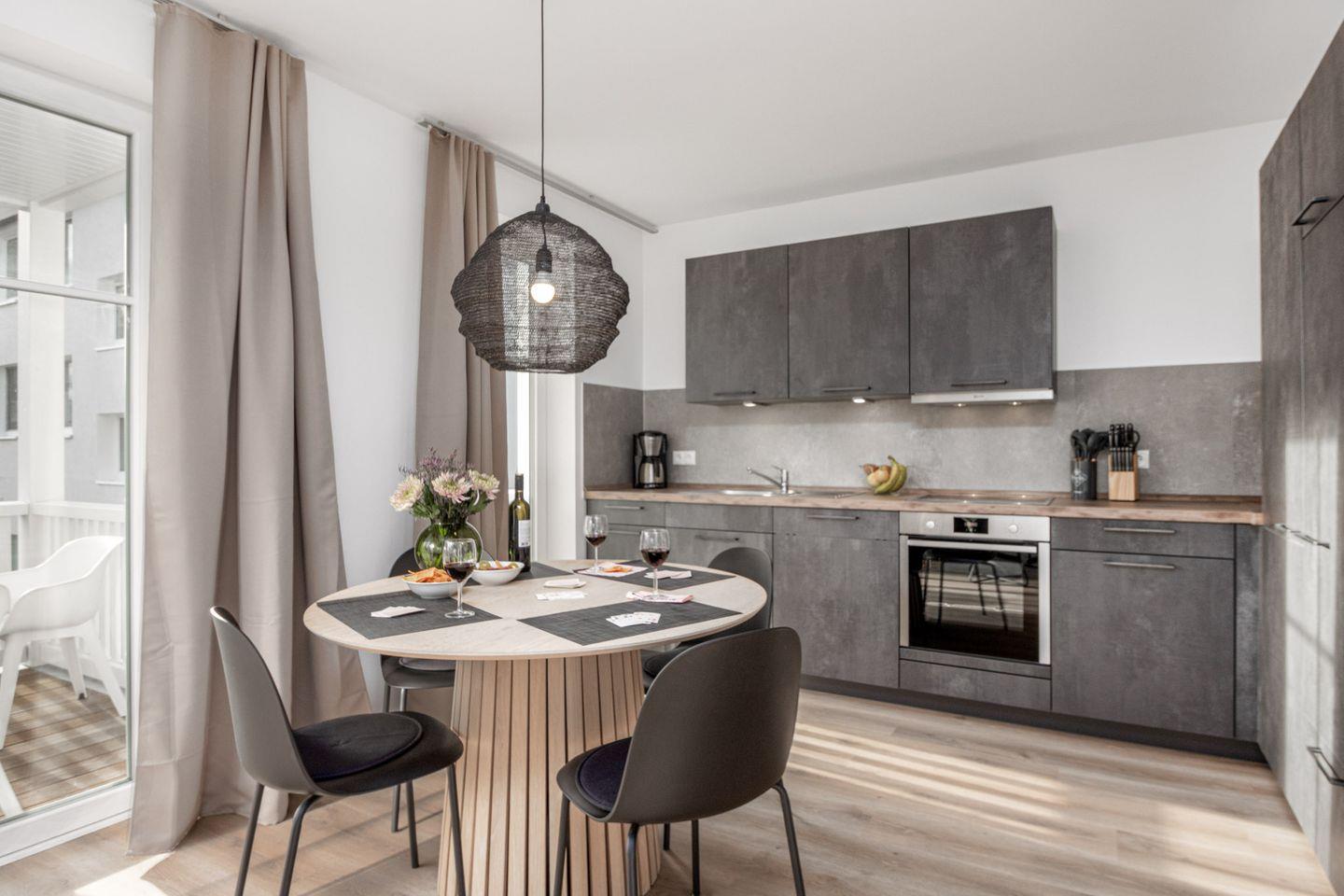 Die offene Küche ist komplett ausgestattet mit modernen Geräten wie Induktionskochfeld, Backofen, Spülmaschine, Kühlschrank mit Gefrierfach, Wasserkocher, Toaster und Kaffeemaschine.