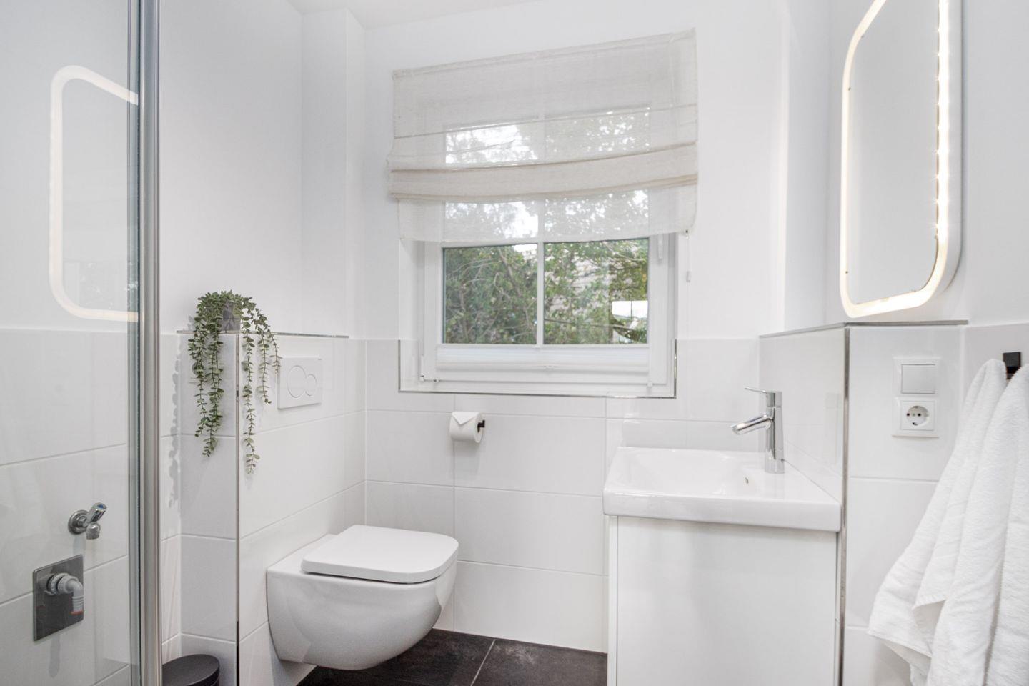 Im Badezimmer finden Sie eine großzügige Echtglas-Duschkabine mit Rainshower-Funktion, ein WC, einen Waschtisch, einen beleuchteten Spiegel und ein Fenster für angenehme Lichtverhältnisse.