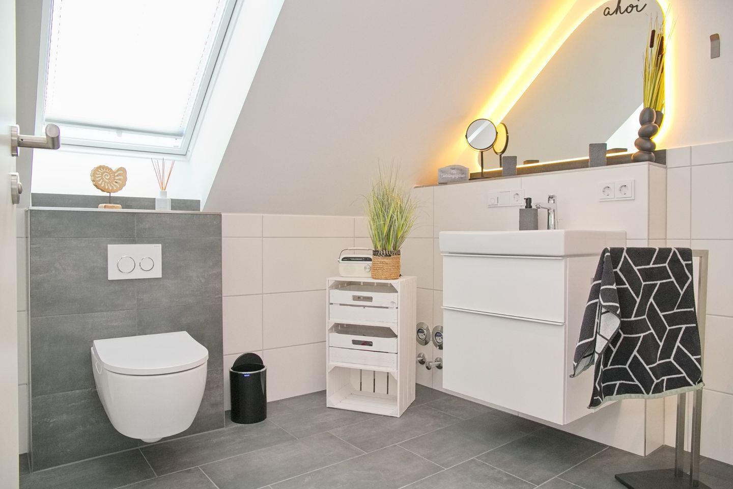 Ihr Bad ist eine kleine Wohlfühloase mit schöner Dusche samt Raindance Brause, WC und elegant gebauter Waschtischeinheit.