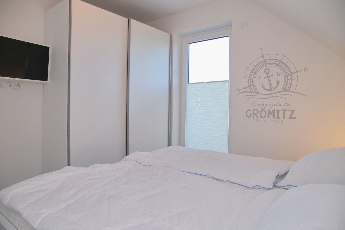 Im Schlafzimmer lädt ein kuscheliges Doppelbett (2x90x200 cm) mit Bettkästen zu süßen Träumen ein und ein Schwebetürenschrank bietet genügend Stauraum für Ihre Urlaubsgarderobe. Ein weiterer Flach TV lädt zu entspannten Filmeabenden im Bett ein.