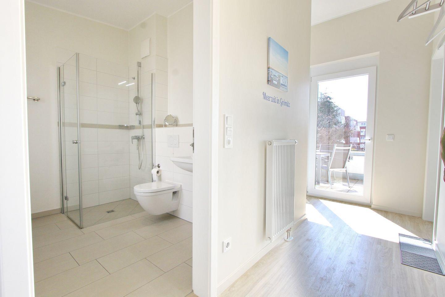 Das moderne und helle Duschbad mit WC hat ein Außenfenster. Es befindet sich ein geräumiger Einbauschrank im Flur sowie eine Waschmaschine für Sie zur Verfügung.