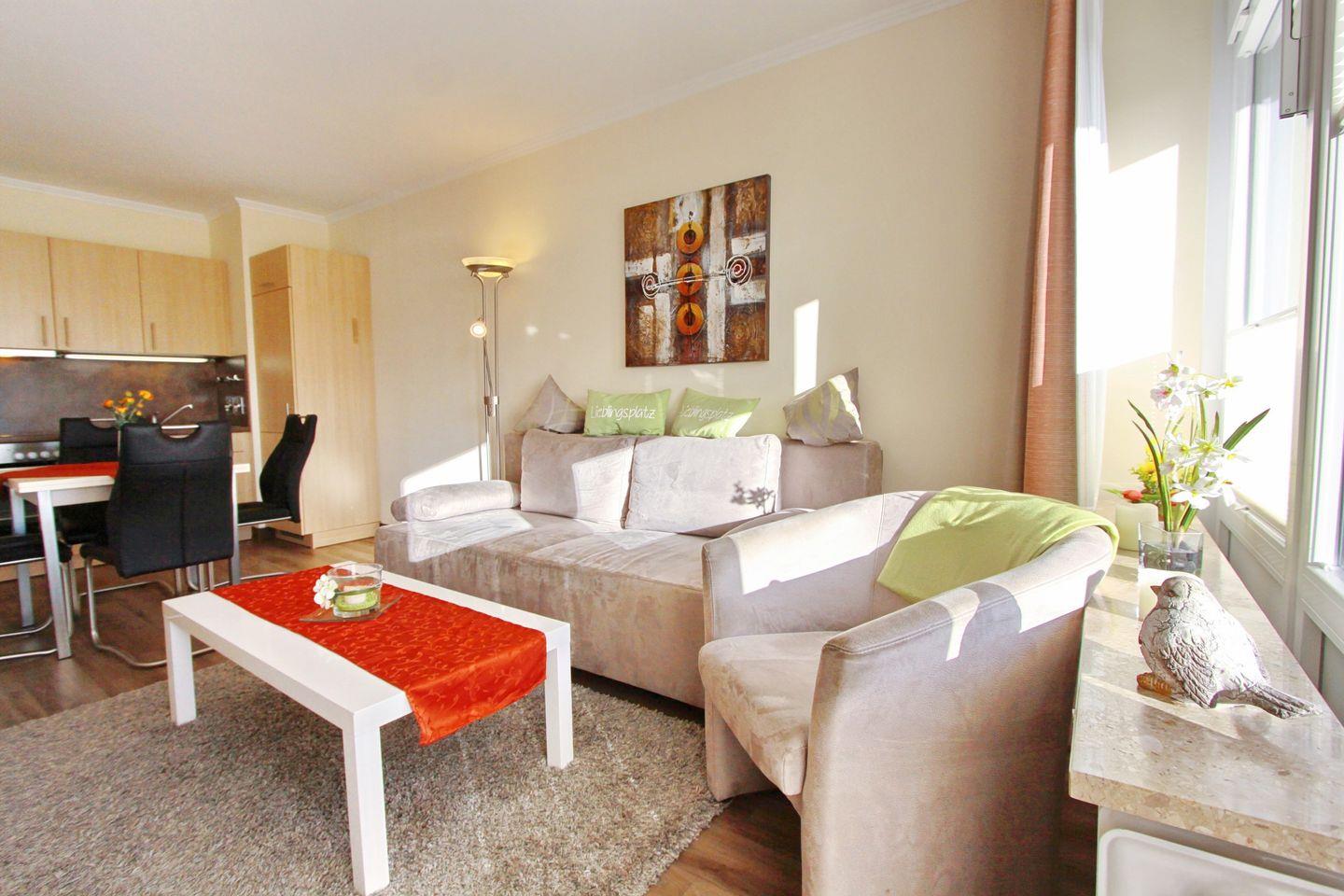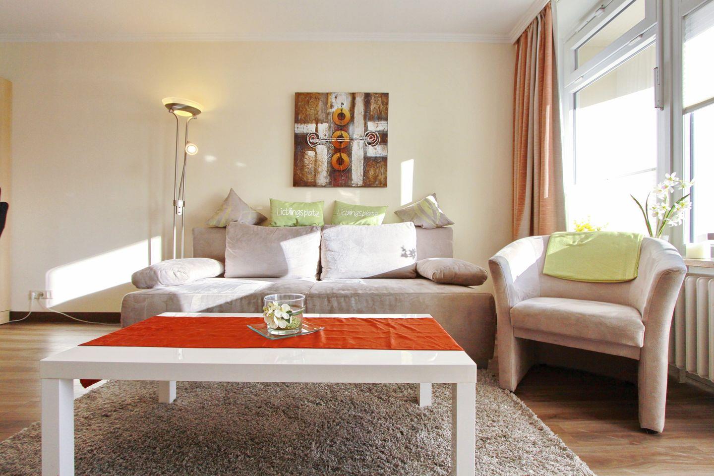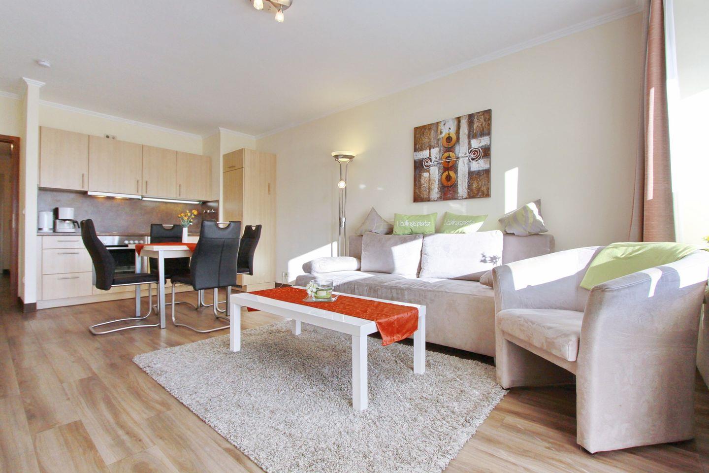 Im Wohnzimmer gibt es eine praktische Schlafcouch, einen Flach-TV, eine Stereoanlage zum einstimmen und eine Essecke mit 4 Stühlen zum geselligen miteinander sein.