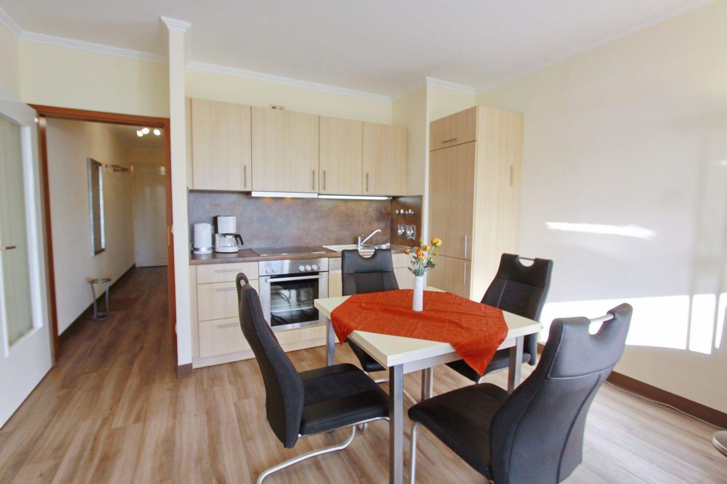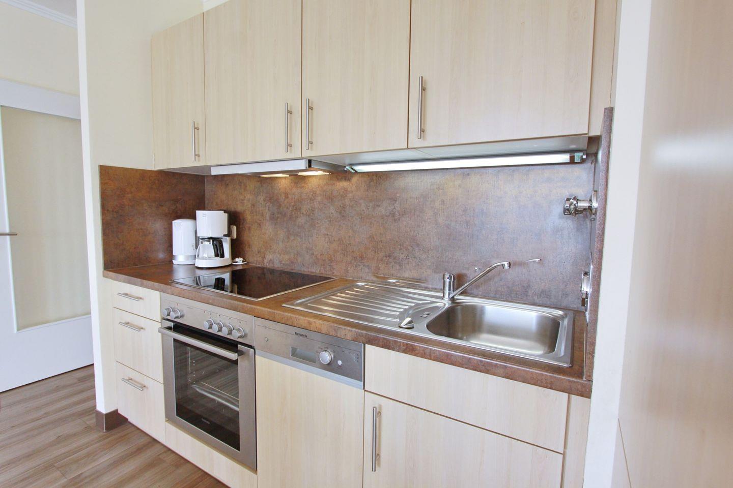 Die zum Wohnzimmer offene und moderne Einbauküche ist mit einem Ceranfeld, Kühlschrank mit Gefrierfach, Spülmaschine, Backofen, Toaster, Wasserkocher und einer Kaffeemaschine ausgestattet.
