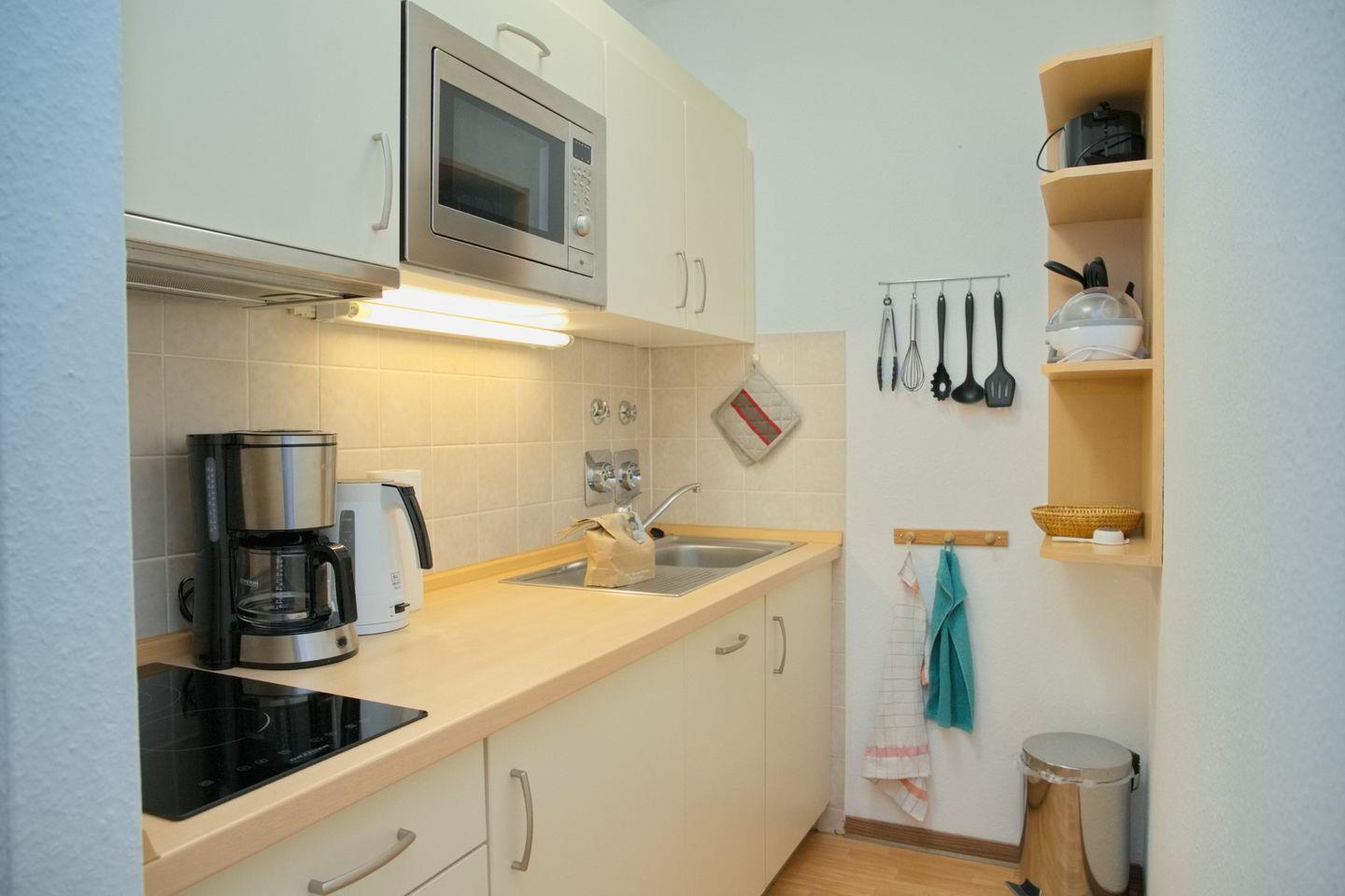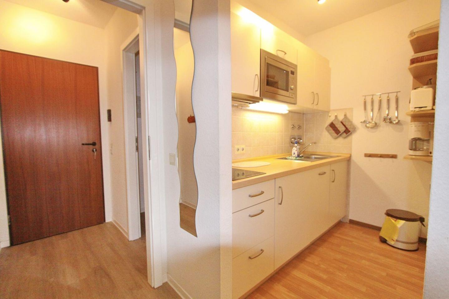 Im Wohnzimmer gibt es eine Schlafcouch, ein TV, ein Radio, sowie einen Essplatz mit 4 Stühlen, hier können Sie den Tag bei einem ausgiebigen Frühstück starten. Von hier gelangen Sie auch auf den möblierten Balkon, lassen Sie Ihren Urlaubstag hier in gemütlicher Atmosphäre ausklingen. Die Küche ist mit einem 2-Platten-Ceranfeld, einem Kühlschrank ohne Gefrierfach, einer Mikrowelle, einer Spülmaschine, einem Toaster, einem Wasserkocher und einer Kaffeemaschine ausgestattet.