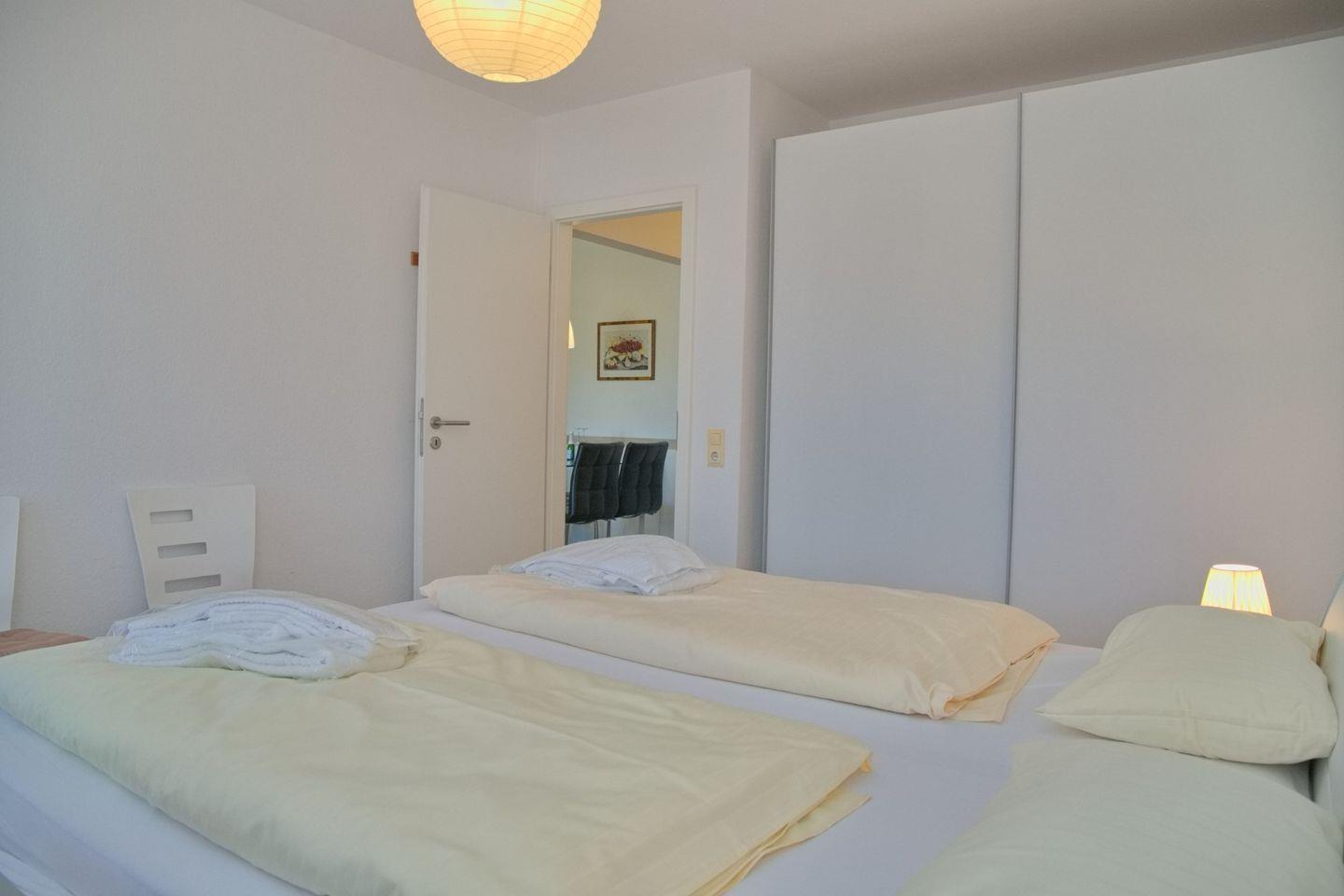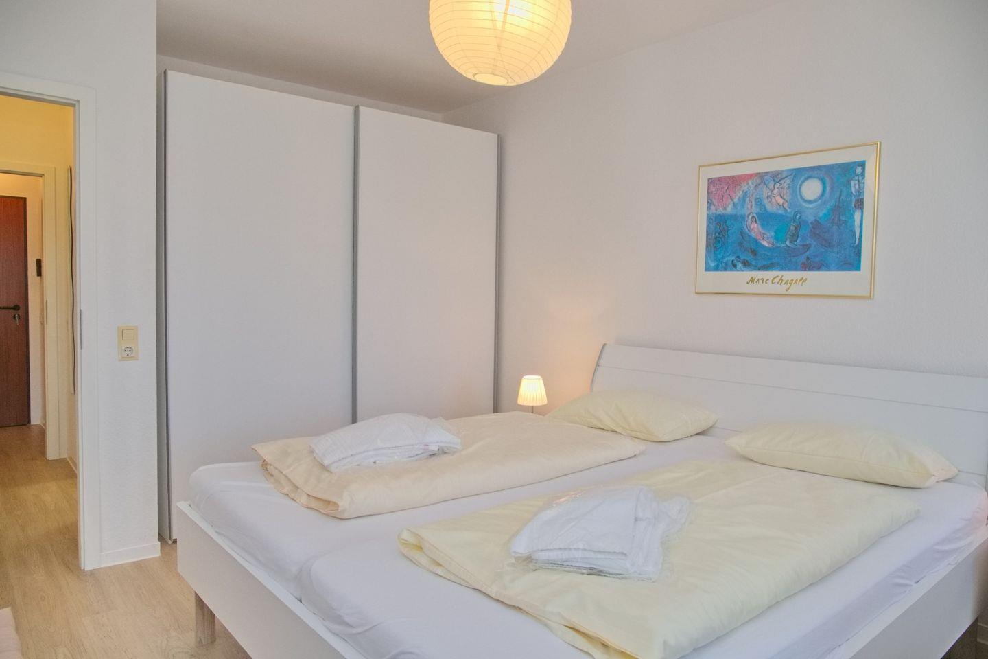 Im Schlafzimmer stehen ein Doppelbett und ein Kleiderschrank. Ein Kinderbett wäre zustellbar.