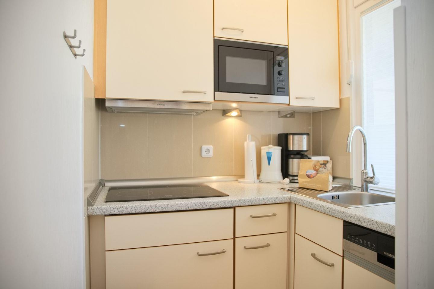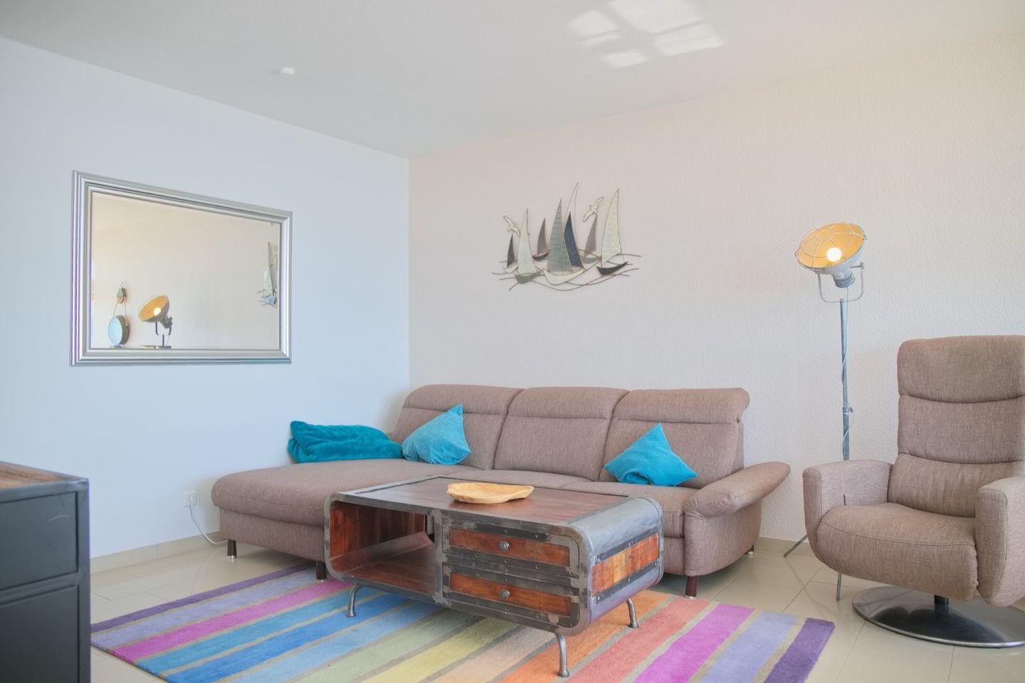 Diese großzügige 3-Zimmer-Wohnung in Südlage begeistert mit einem Balkon und einem atemberaubenden Blick über die Lübecker Bucht – sogar die bekannte Seebrücke von Grömitz lässt sich vom Schlafzimmerfenster aus sehen. Das helle Wohnzimmer ist mit einer gemütlichen Eckcouch, einem bequemen TV-Sessel, einem Flatscreen und einem Radio ausgestattet. Im angrenzenden Essbereich finden bis zu vier Personen bequem Platz. Die moderne Küche verfügt über einen Kühlschrank mit 3*-Gefrierfach, einen Geschirrspüler, eine Mikrowelle, Kaffeemaschine, Wasserkocher und Toaster – ideal für Selbstversorger, die im Urlaub nicht auf Komfort verzichten möchten.