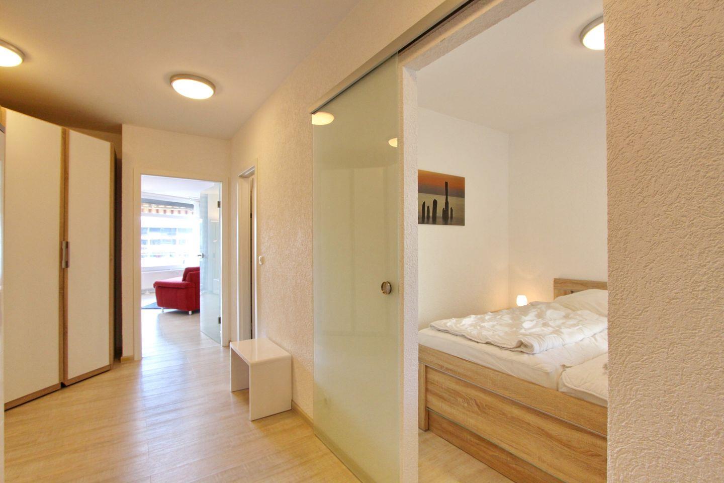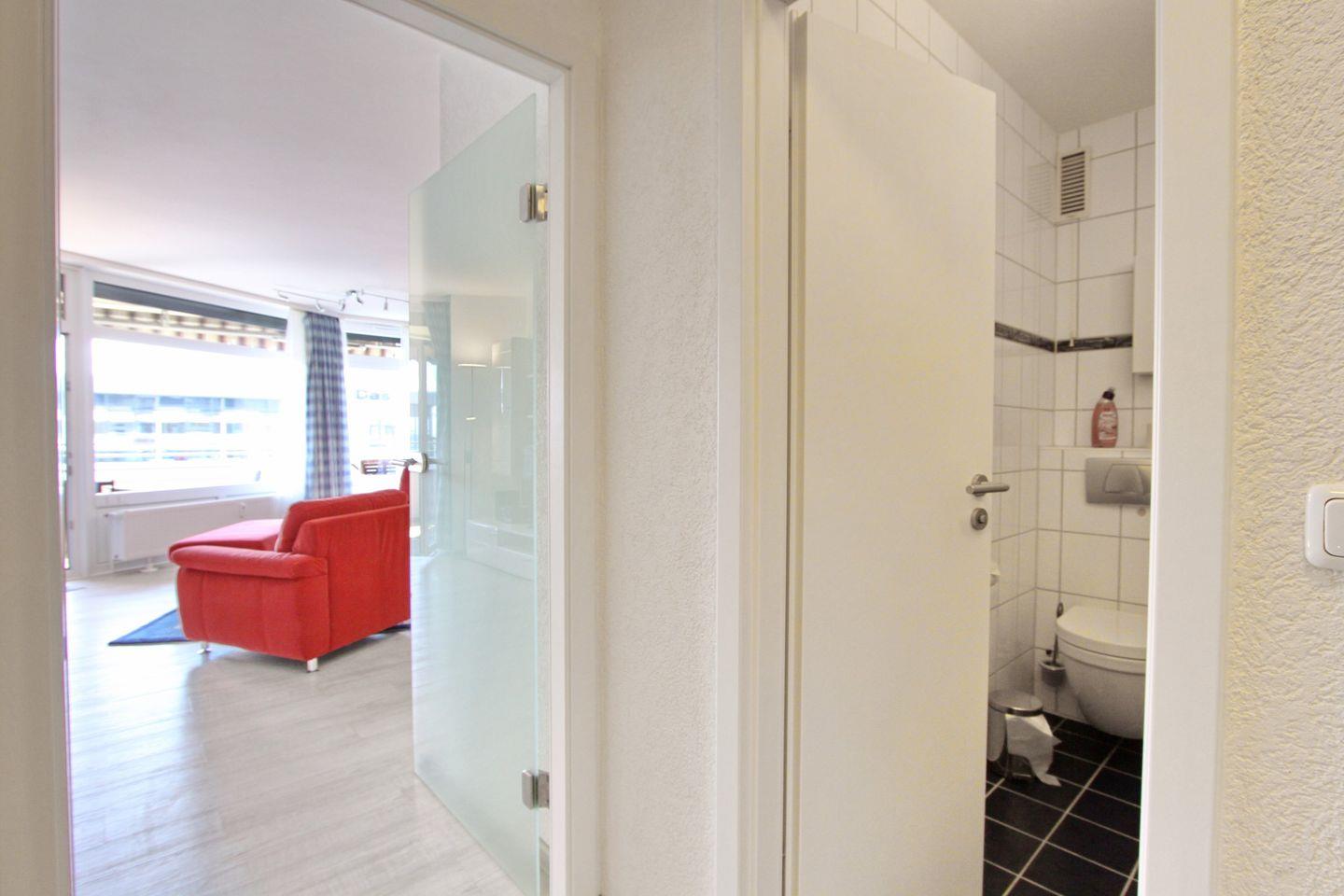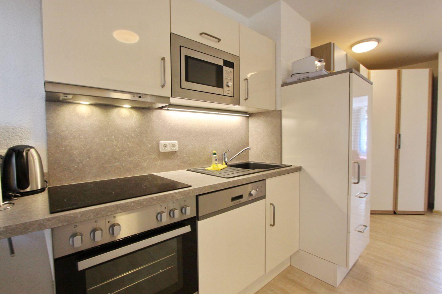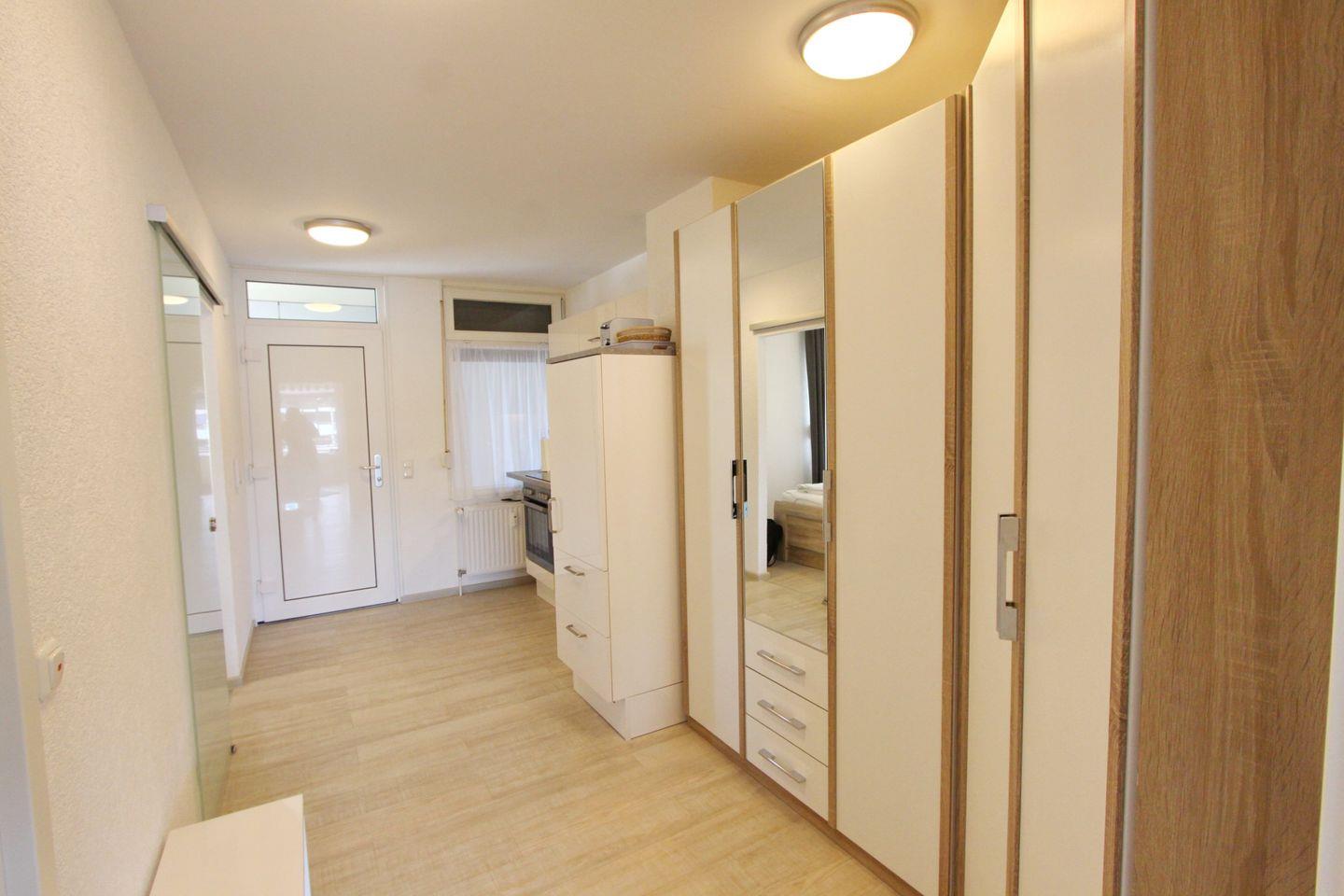 An das Wohnzimmer angrenzend finden Sie die offene Einbauküche,direkt im Eingangsbereich der Wohnung, welche mit einem Cerankochfeld, einem Backofen, einem Kühlschrank mit Gefrierfach, einer Geschirrspülmaschine, einer Mikrowelle, einem Wasserkocher, einem Toaster und einer Kaffeemaschine ausgestattet ist. Ein Kleiderschrank steht Ihnen hier ebenfalls zur Verfügung. Vom Wohnzimmer haben Sie den Zugang zum möblierten Balkon.
