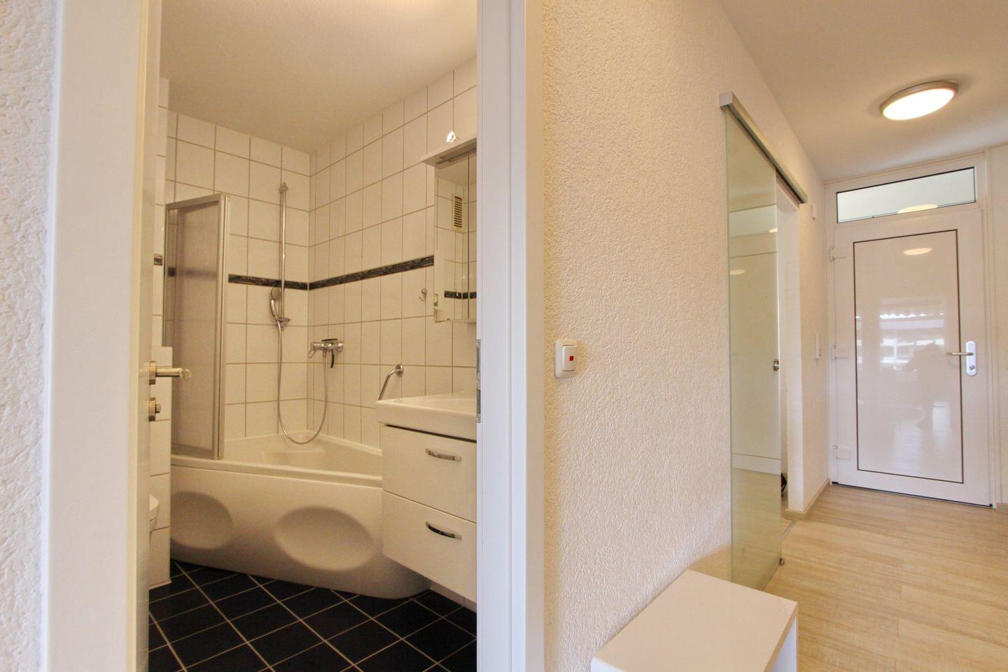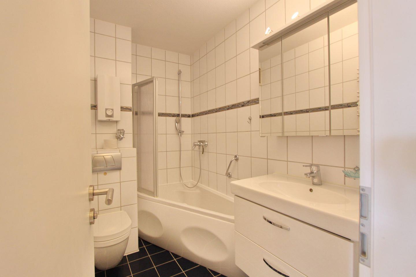 Das helle Badezimmer bietet Ihnen eine Badewanne mit Duschvorrichtung, einem WC, einem Waschtisch und einer Handtuchheizung.