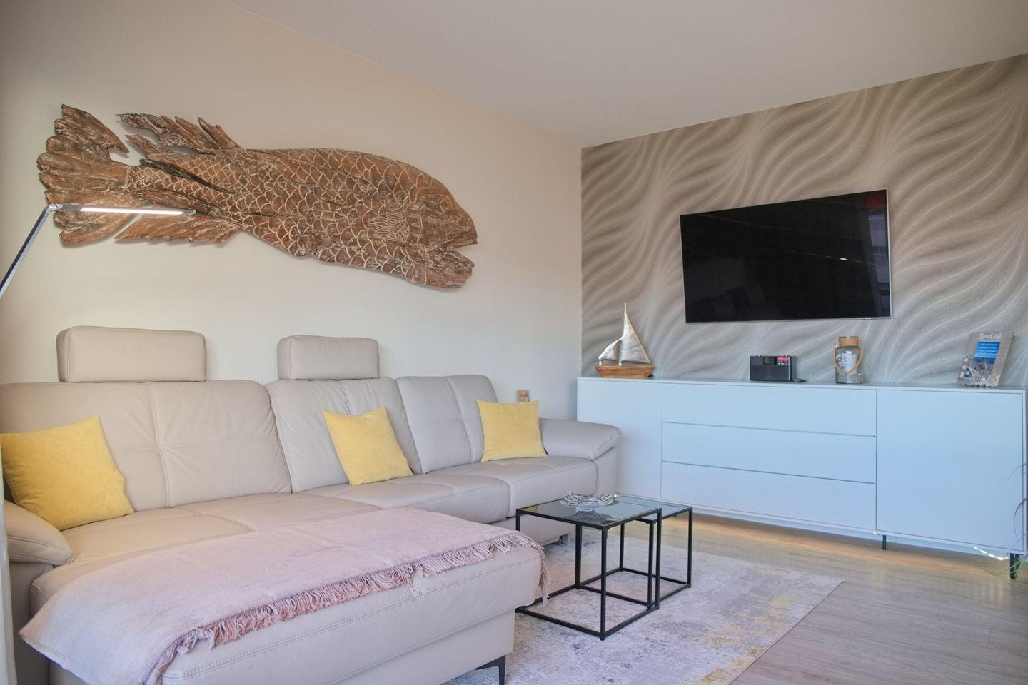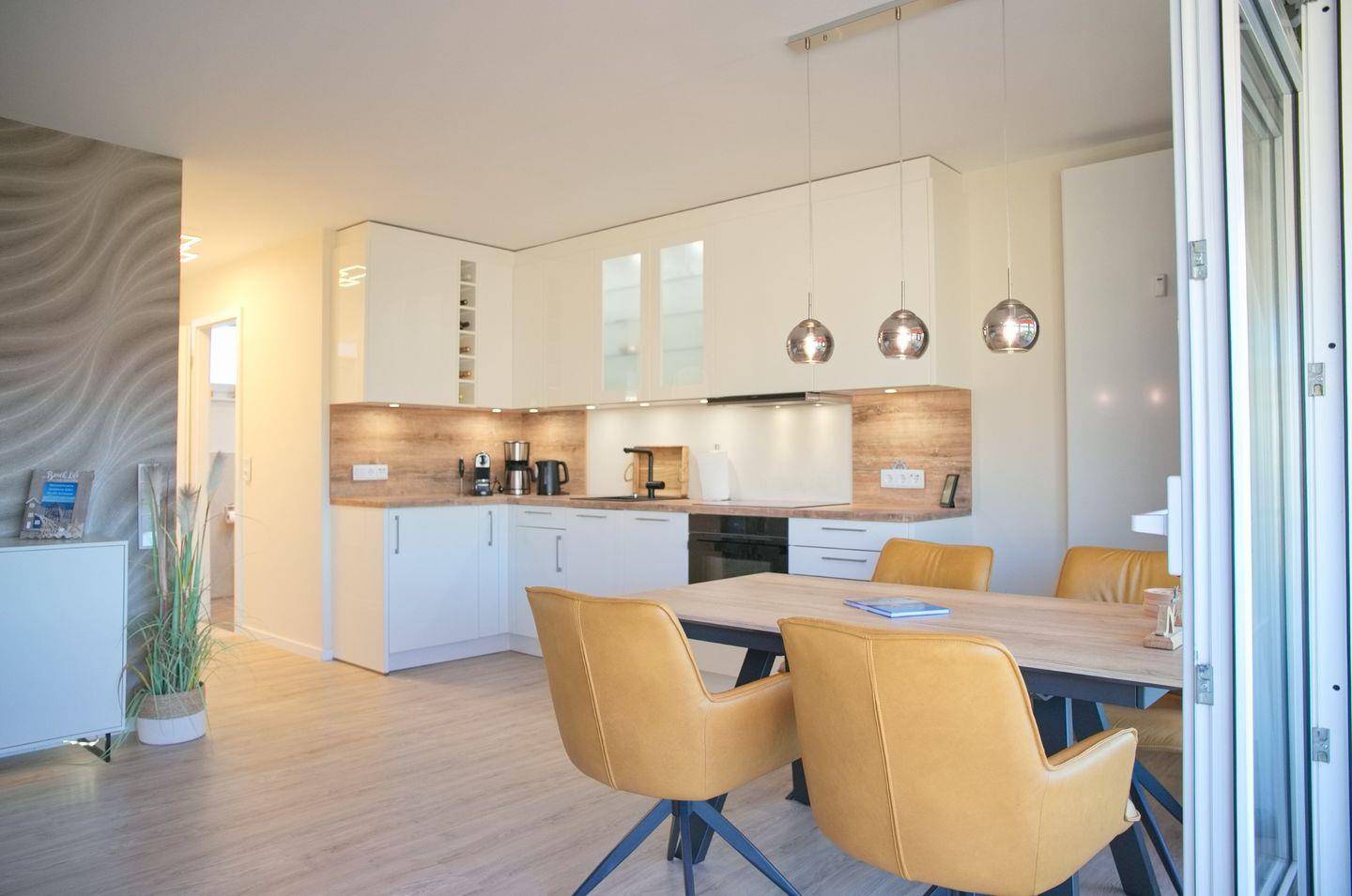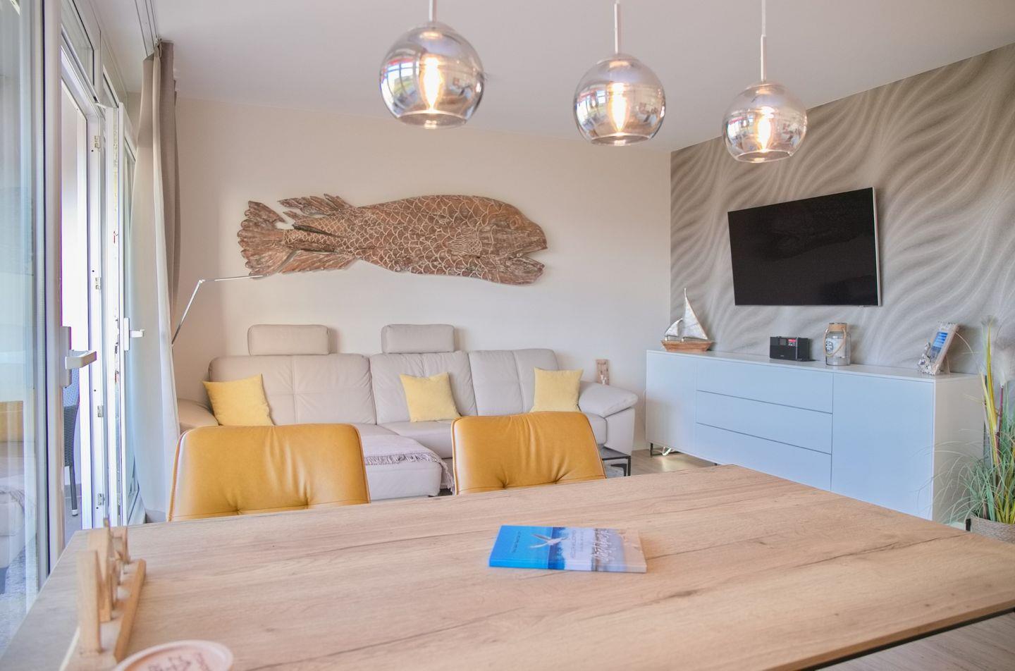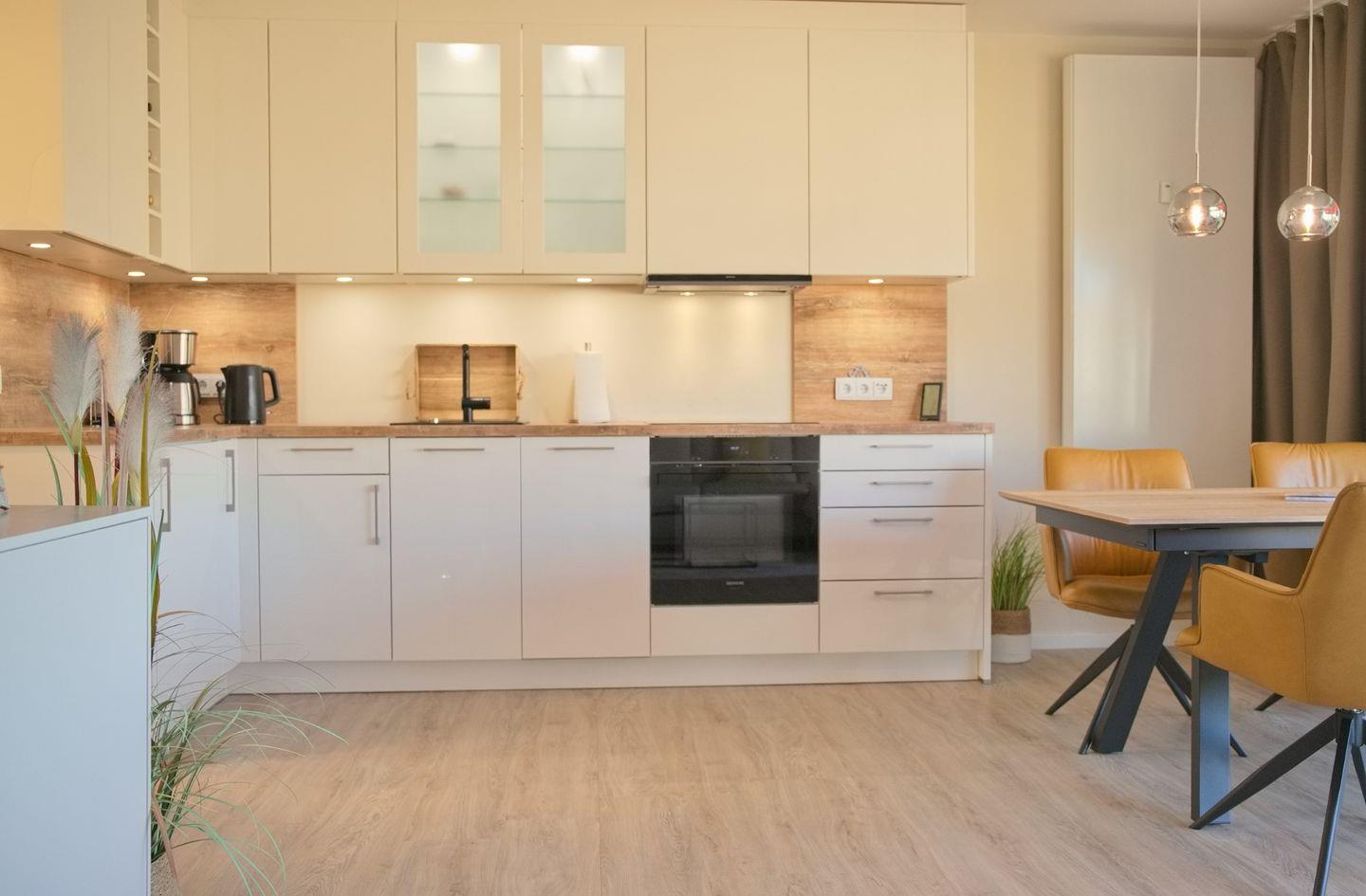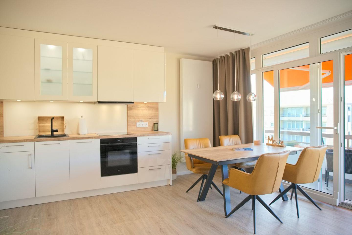 Die helle und einladende Wohnung verfügt über ein komfortables Schlafzimmer sowie einen Wohn- und Essbereich mit einer gemütlichen Sofaecke. Das Wohnzimmer ist mit einem Fernseher, CD-Spieler und Radio ausgestattet, sodass Sie auch in der Wohnung für Unterhaltung sorgen können. Die offene Küche ist komplett eingerichtet mit modernen Geräten wie einem Induktionskochfeld, Backofen, Geschirrspüler und einer Nespresso-Kaffeemaschine. Hier können Sie kulinarische Köstlichkeiten zubereiten und diese am Esstisch genießen.