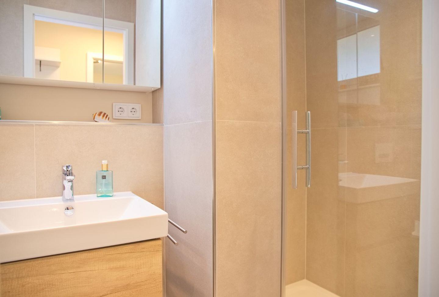 Das Badezimmer ist mit einer Dusche, Waschtisch, Spiegel und WC ausgestattet und bietet alles, was Sie für Ihr tägliches Wohlbefinden brauchen. Für zusätzlichen Komfort sorgen eine Waschmaschine und ein Trockner, die gemeinschaftlich genutzt werden können. Außerdem stehen Ihnen Gartenmöbel auf dem Balkon zur Verfügung, sodass Sie nach einem erlebnisreichen Tag im Freien entspannen können.