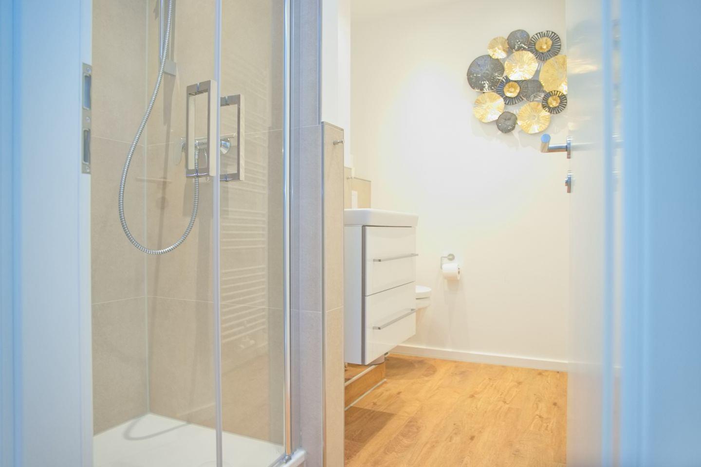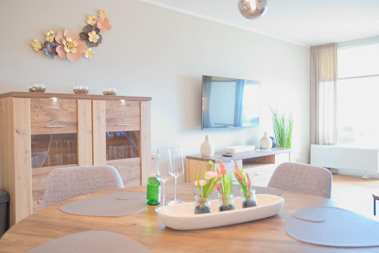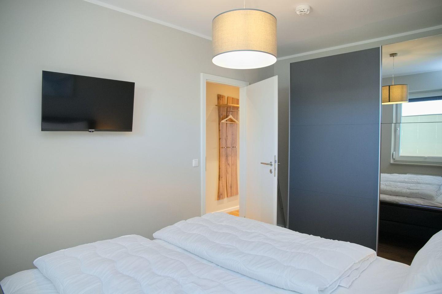 Die Wohnung ist mit zwei Fernsehern ausgestattet, sodass Unterhaltung für alle garantierte ist. Die Schlafmöglichkeiten sind ebenfalls komfortabel gestaltet; das Schlafzimmer bietet ein modernes Boxspringbett (durchgehende Matratze 180x200 cm), das Wohnzimmer hält eine hochwertige Schlafcouch bereit, während das Badezimmer mit einer Dusche, einem WC und einem Waschbecken ausgestattet ist. Zudem stehen Ihnen eine Waschmaschine und ein Trockner zur gemeinschaftlichen Nutzung zur Verfügung, um Ihre Wäsche bequem im Urlaub zu waschen.