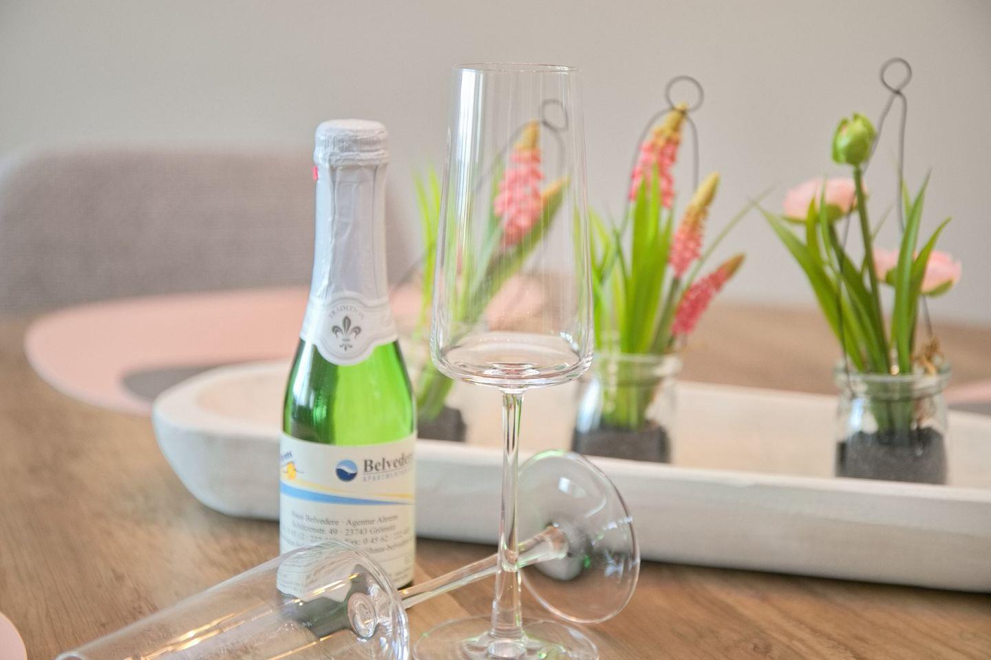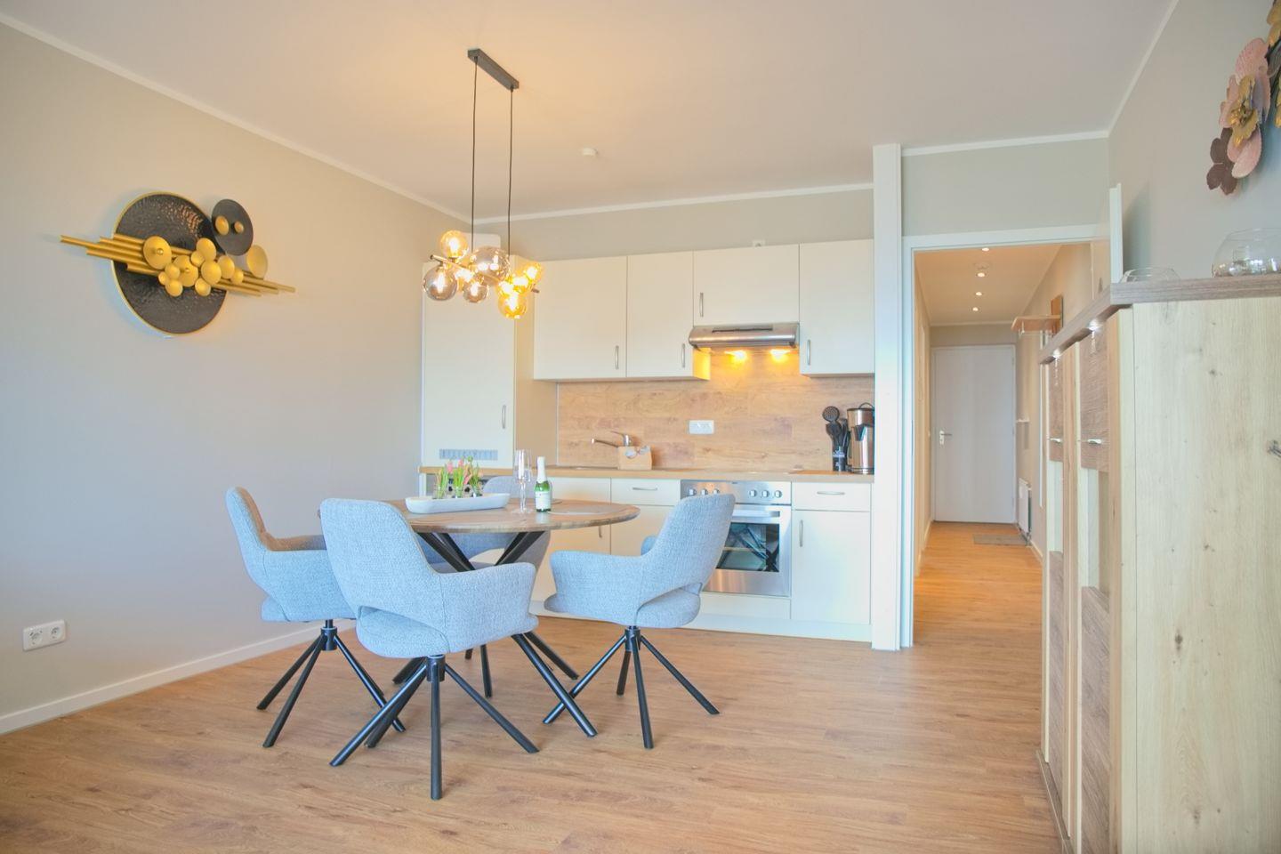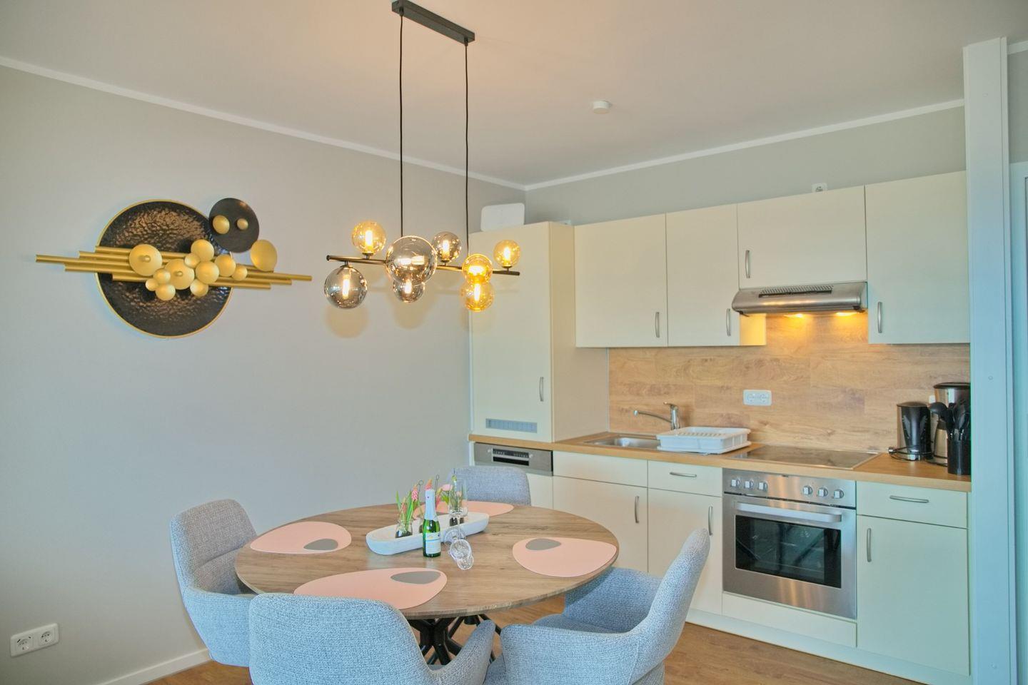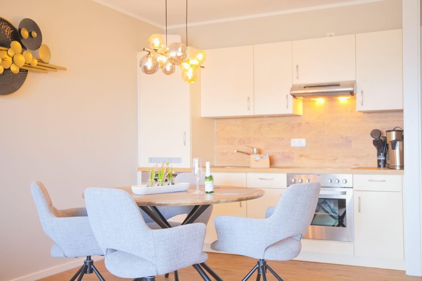Die Wohnung besticht durch eine offene, lichtdurchflutete Koch- und Wohnlandschaft, die perfekt für gesellige Abende ist. Die Küche umfasst einen Ceran-Herd, einen Backofen, eine Spülmaschine sowie alle notwendigen Küchenutensilien, einschließlich einer Kaffeemaschine, eines Wasserkochers und eines Toasters. Ob morgendlicher Kaffee auf dem Balkon oder ein gemütliches Dinner am Esstisch – hier kommen Feinschmecker voll und ganz auf ihre Kosten.