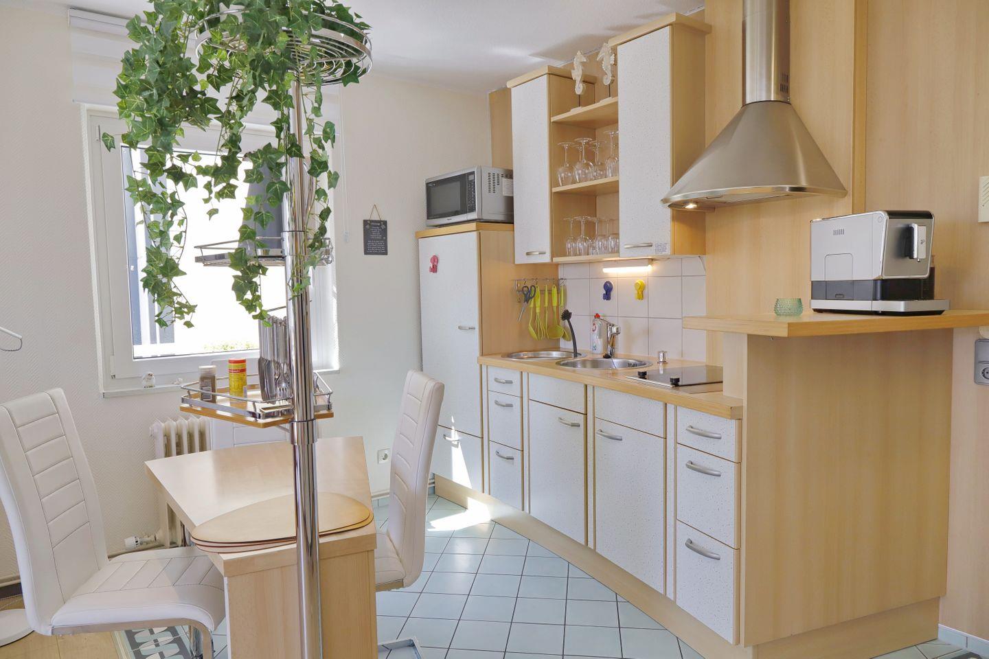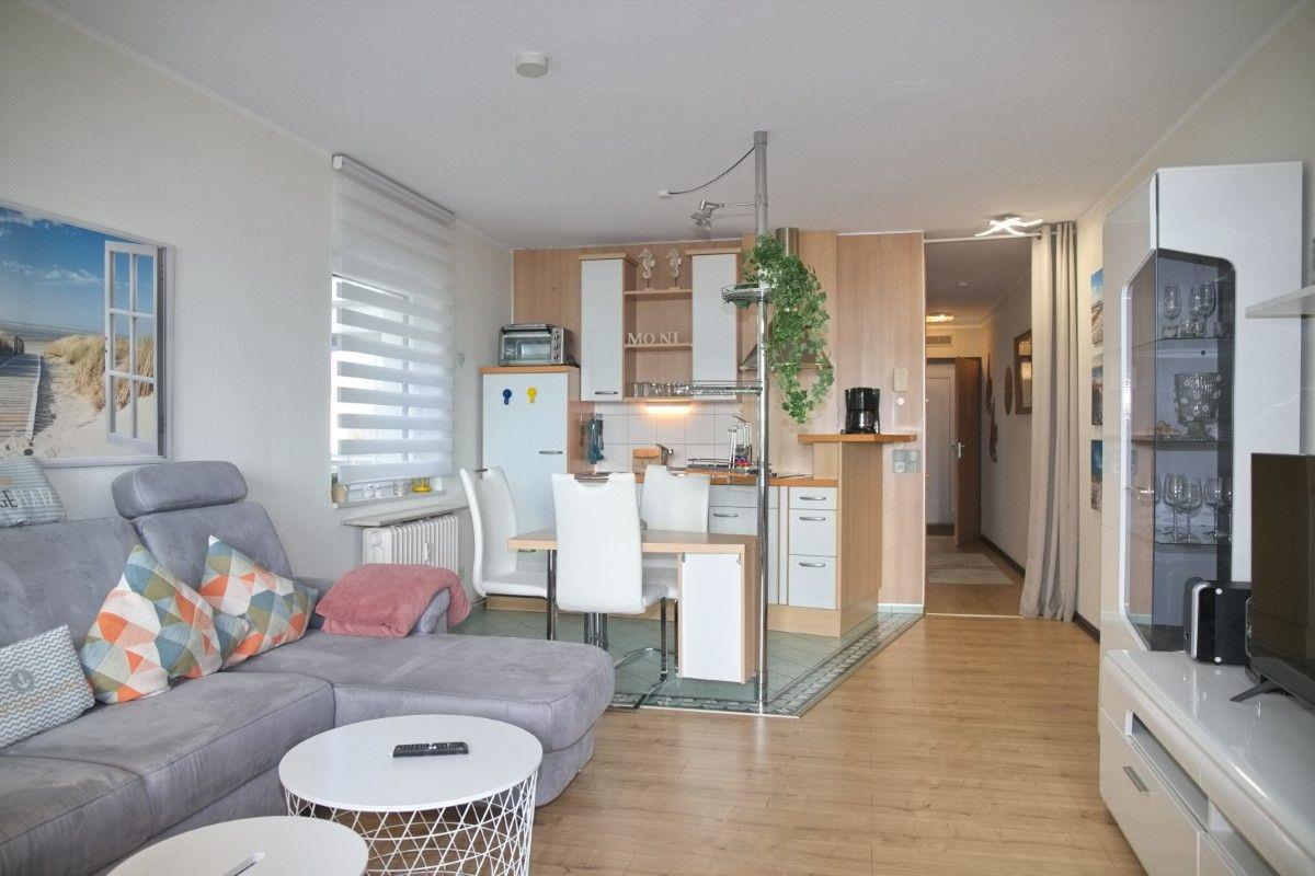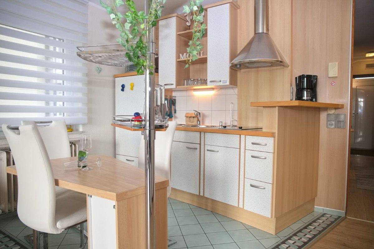 Durch die weiße Diele mit einer tollen Garderobe betreten Sie das Wohnzimmer mit offener Küche und einem gemütlichen Essbereich. Die Küche ist mit allem ausgestattet, was der moderne Urlauber braucht, um sich ein leckeres Mittagessen zu zaubern. Ein 2er- Ceranfeld, eine Mikrowellen- Backofen- Kombi sowie Kaffeemaschine und Toaster sorgen für ein gelungenes Frühstück.