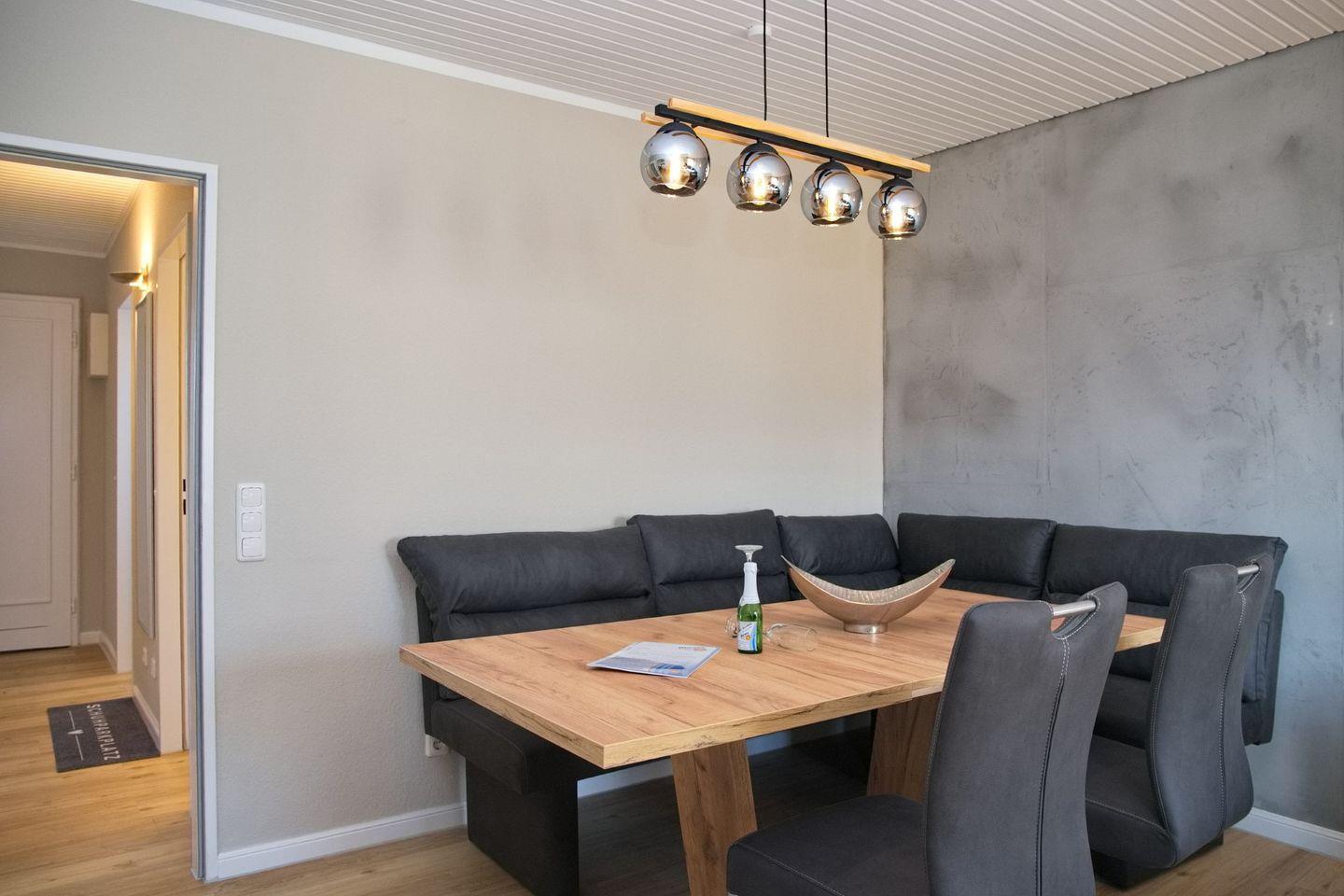 Der Essbereich bietet Platz für vier Personen und verfügt über eine moderne Essbank mit zwei Stühlen und einem großzügigen Tisch, ideal für gemeinsame Mahlzeiten oder Spieleabende.