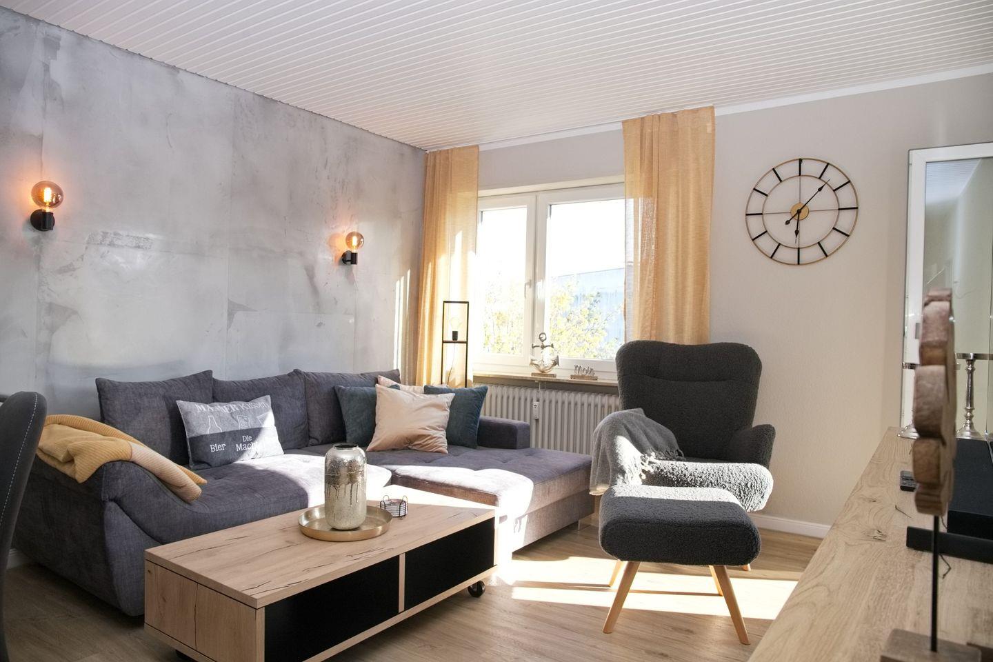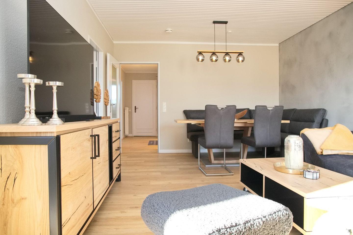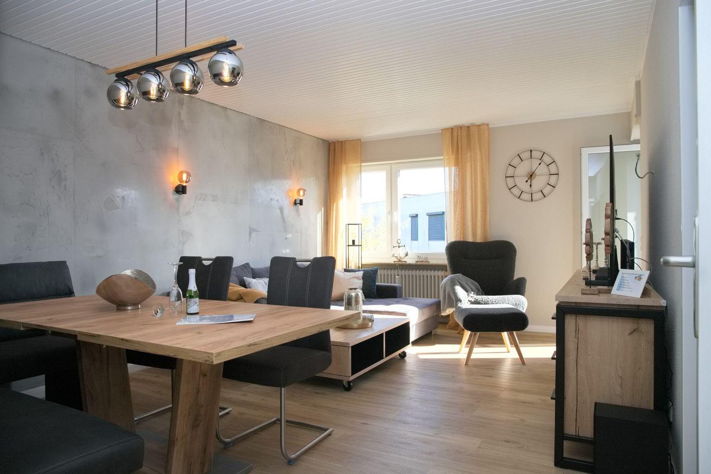 Das Wohnzimmer ist geschmackvoll eingerichtet und verfügt über eine gemütliche Eckcouch, einen Sessel mit Fußhocker und einen großen Flachbildfernseher, der perfekt für entspannte Abende nach einem Tag am Strand geeignet ist.