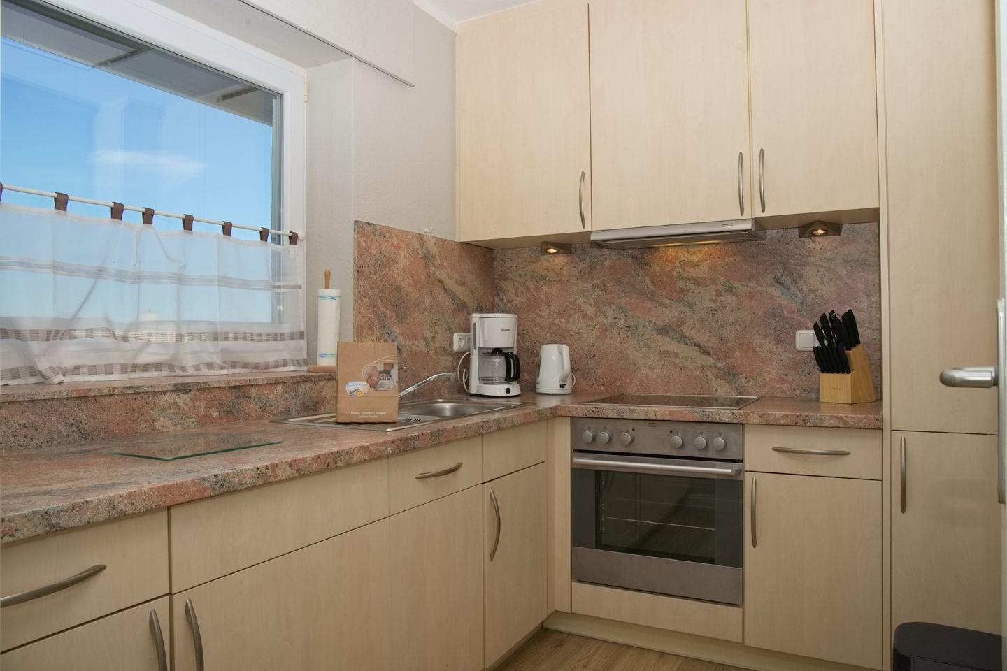 Die Küche ist voll ausgestattet mit einem Backofen, Ceranfeld (4x), einem Kühlschrank mit Gefrierfach, Geschirrspüler, Wasserkocher, Kaffeemaschine und Toaster, sodass Sie sich problemlos selbst verpflegen können.