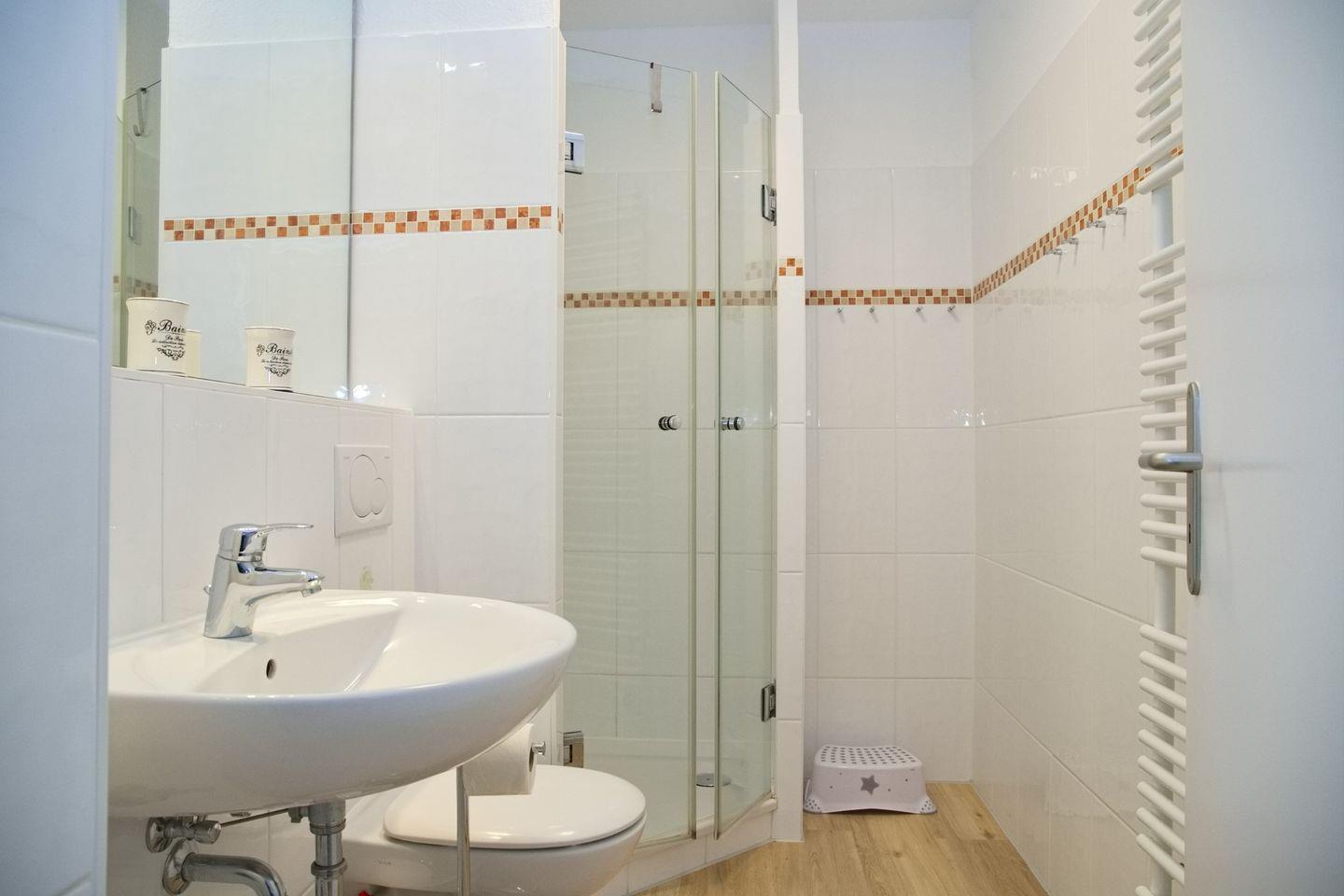 Das Badezimmer ist modern gestaltet und verfügt über eine Eck-Dusche mit Glastür, WC, Waschbecken, einen großen Spiegel und einen Handtuchheizkörper für angenehme Wärme nach dem Duschen.