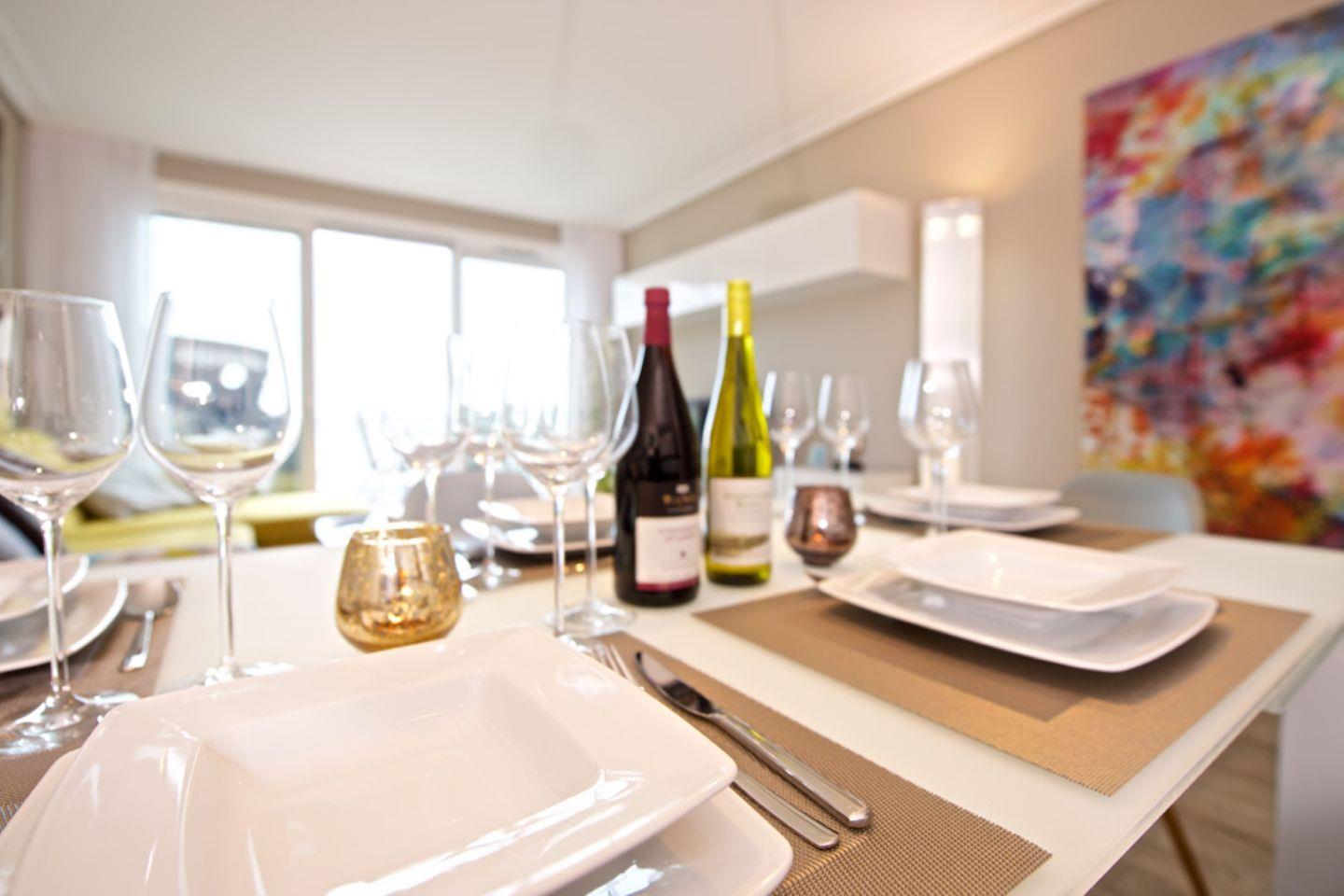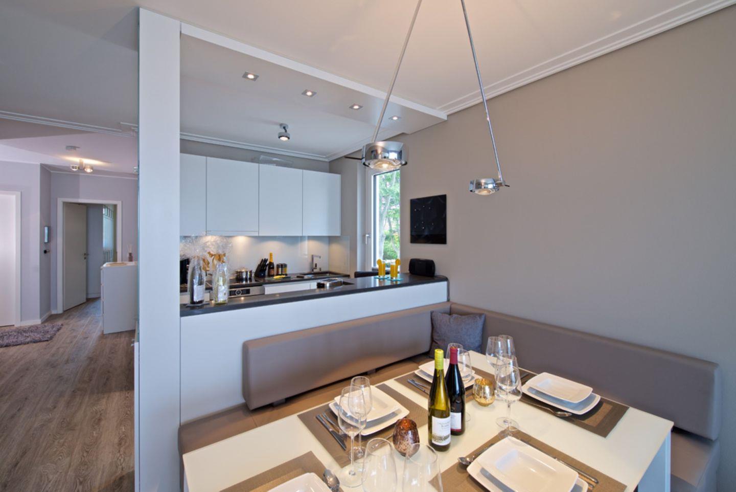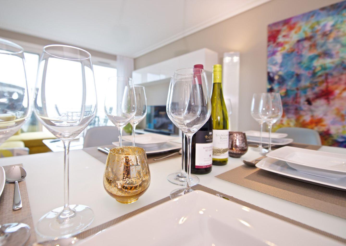 An einem ausgezeichneten Blick auf den Strand und den Yachthafen Grömitz können Sie sich vom geräumigen und möblierten Balkon aus erfreuen. Die schöne offene Küche mit Thekenbereich ist ausgestattet mit einem Induktionskochfeld, einem modernsten 4-D-Backofen mit integrierter Mikrowelle, einem Kühlschrank mit 3*Gefrierfach, einer großen Spülmaschine, Kaffeemaschine, Wasserkocher und Toaster. Die gemütliche Essecke bietet 6 Personen viel Platz zum Essen, Spielen und gemütlichen Beisammensein bei hochwertiger LED-Beleuchtung.