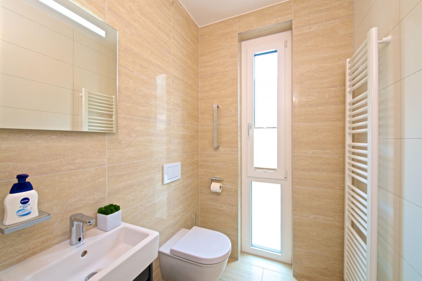 Das moderne Tageslichtbad verfügt über einen Doppelwaschtisch mit integrierten Schubladen, einem großen beleuchteten Spiegelschrank, einer geräumigen ebenerdigen Dusche, einem Handtuchheizkörper und einem WC. Eine Waschmaschine und Trockner stehen Ihnen kostenlos zur Verfügung. Ein separates WC mit einem weiteren Handtuchheizkörper steht Ihnen zur Verfügung.