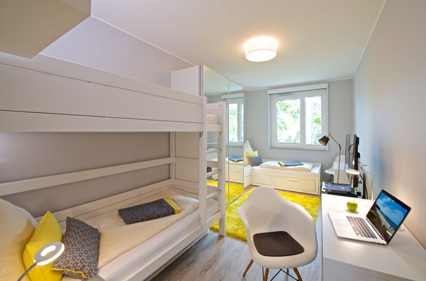 Im Schlafzimmer steht ein Doppelbett (2 x 90cm x 200 cm) mit höhenverstellbaren Kopfteilen. Der hochwertige Einbaukleiderschrank ermöglicht Ihnen dank integrierter LED-Beleuchtung eine schnelle Kleiderauswahl. Das Zimmer lässt sich zum Schlafen mit der elektrischen Verdunkelung bequem per Schalter vollständig abdunkeln. Im 2. Schlafzimmer ist bequem Platz für bis zu drei Personen. Ein stabiles Etagenbett (90 x 200cm) und ein Einzelbett (90 x 200cm) stehen zur Verfügung. Ein großer Kleiderschrank bietet genügend Raum für Ihre Kleidung. Ein Schreibtisch bietet Gelegenheit für Schreibarbeiten oder einem Laptop. Ein zweiter Flach-TV mit Konsolenanschluss steht bereit. Auch dieses Schlafzimmer lässt sich zum Schlafen mit der elektrischen Verdunkelung bequem per Schalter vollständig abdunkeln.