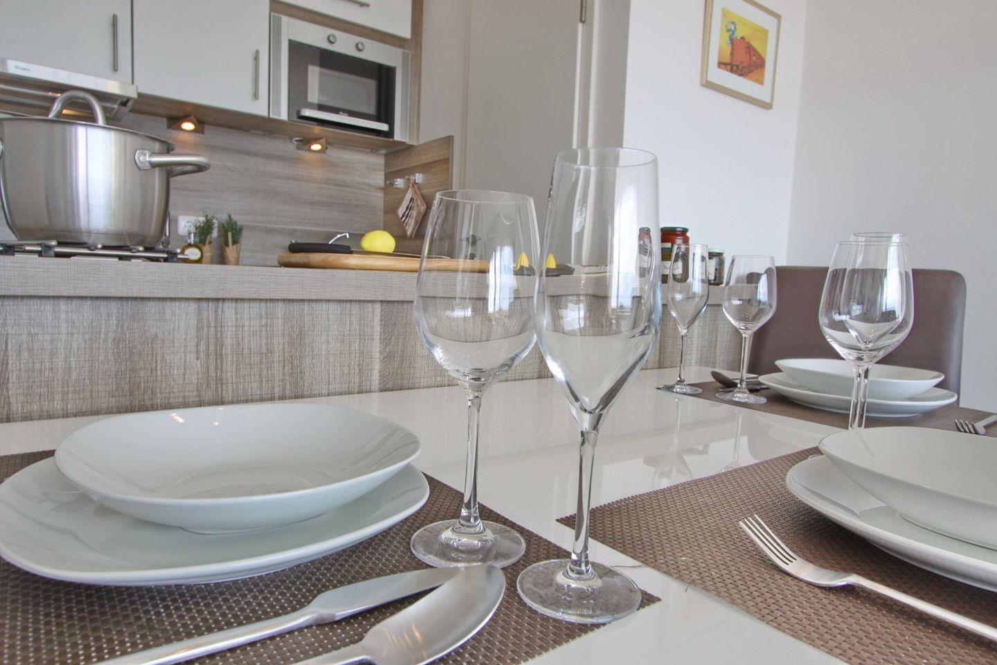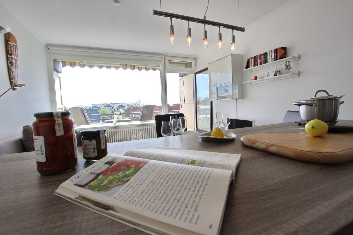 Im modern eingerichteten Wohnzimmer befindet sich eine Schlafcouch (160 cm, 2 geteilt), ein Flach-TV, ein Essbereich mit vier Stühlen und dem Zugang zum Balkon. Die stilvolle und offene Einbauküche ist mit einem Ceranfeld, einem Backofen, einer Mikrowelle, einer Geschirrspülmaschine, einem Kühlschrank mit 3*-Gefrierfach, einem Toaster, einer Kaffeemaschine und einem Wasserkocher ausgestattet.