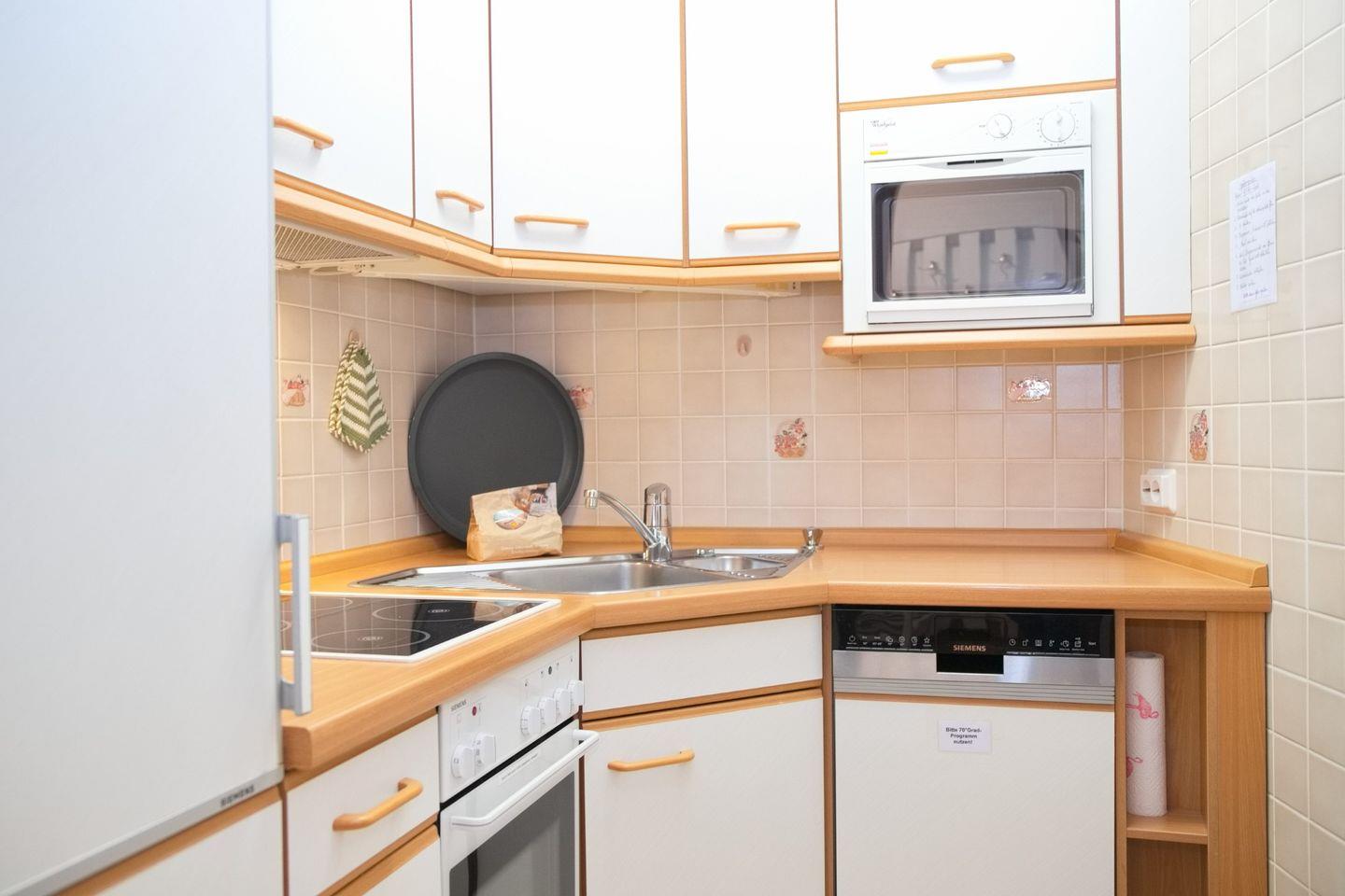 Vom Flur aus rechts abgehend befindet sich die separate Einbauküche mit Cerankochfeld, Backofen, Kühlschrank mit Gefrierfach, Mikrowelle, Spülmaschine und weitere kleine nützliche Küchenhelfer. Einen Raum weiter finden Sie das Moderne Duschbad mit Runddusche, WC und Waschbecken mit Spiegel.