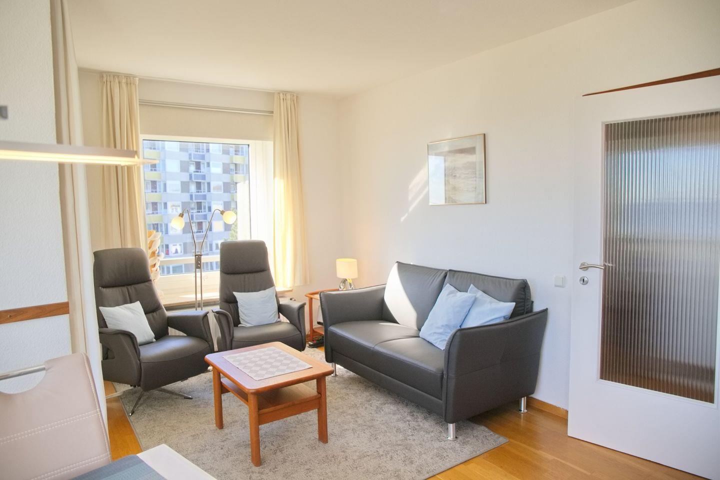 Das Wohnzimmer besticht mit dem herrlichen Panoramablick und bietet Ihnen zwei Ledersessel und eine Couch. Ein Flach TV und ein Radio mit CD Player stehen zur Unterhaltung bereit. Der Essbereich steht direkt vor der Fensterfront und bietet ausreichend Platz.