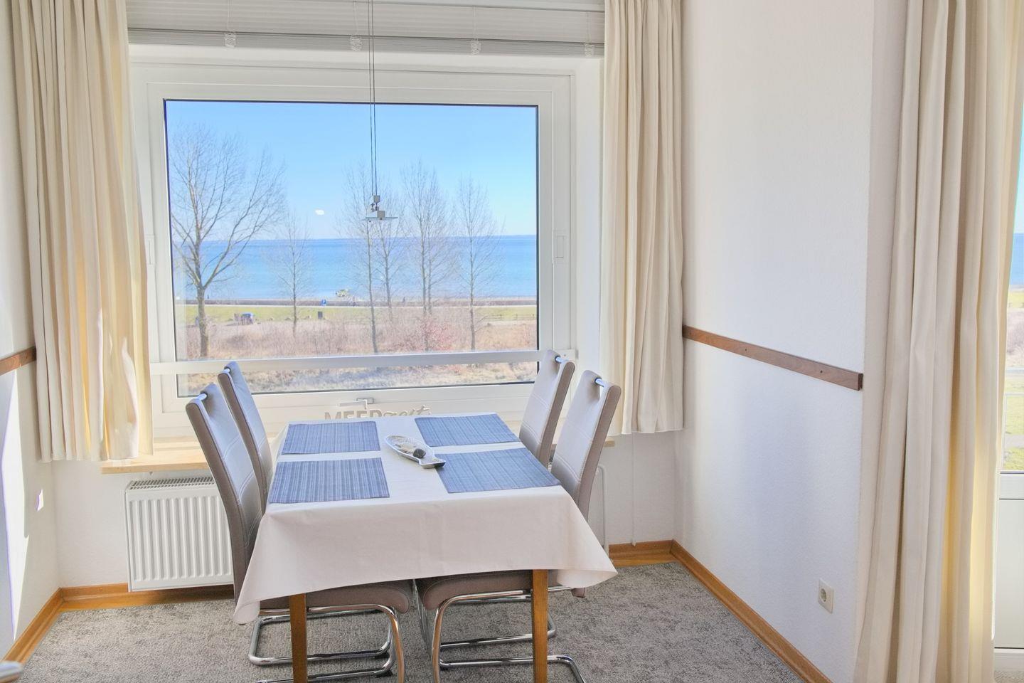 Komfortable Ferienwohnung direkt hinter dem Deich mit möblierten Südbalkon und traumhaften Panoramablick über die gesamte Lübecker Bucht.