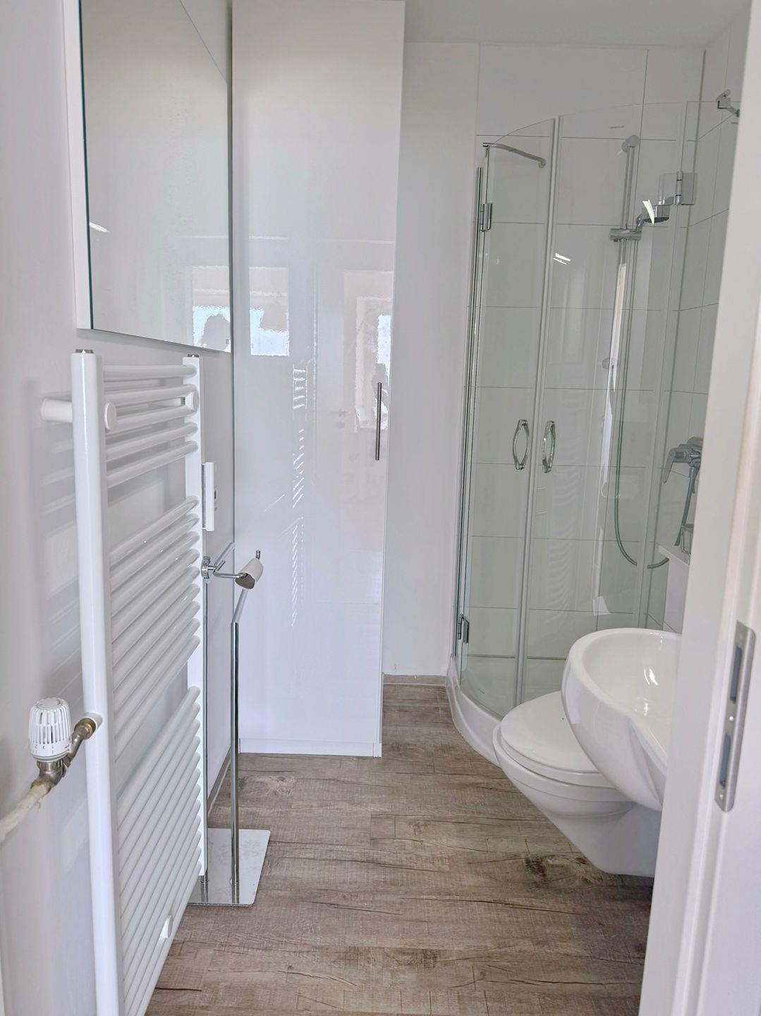 Das Badezimmer verfügt über eine moderne Rund-Dusche mit erhöhtem Einstieg für zusätzlichen Komfort. Neben dem WC und dem Waschtisch gibt es einen praktischen Putzschrank und eine Infrarotspiegelheizung für wohlige Wärme nach dem Duschen.