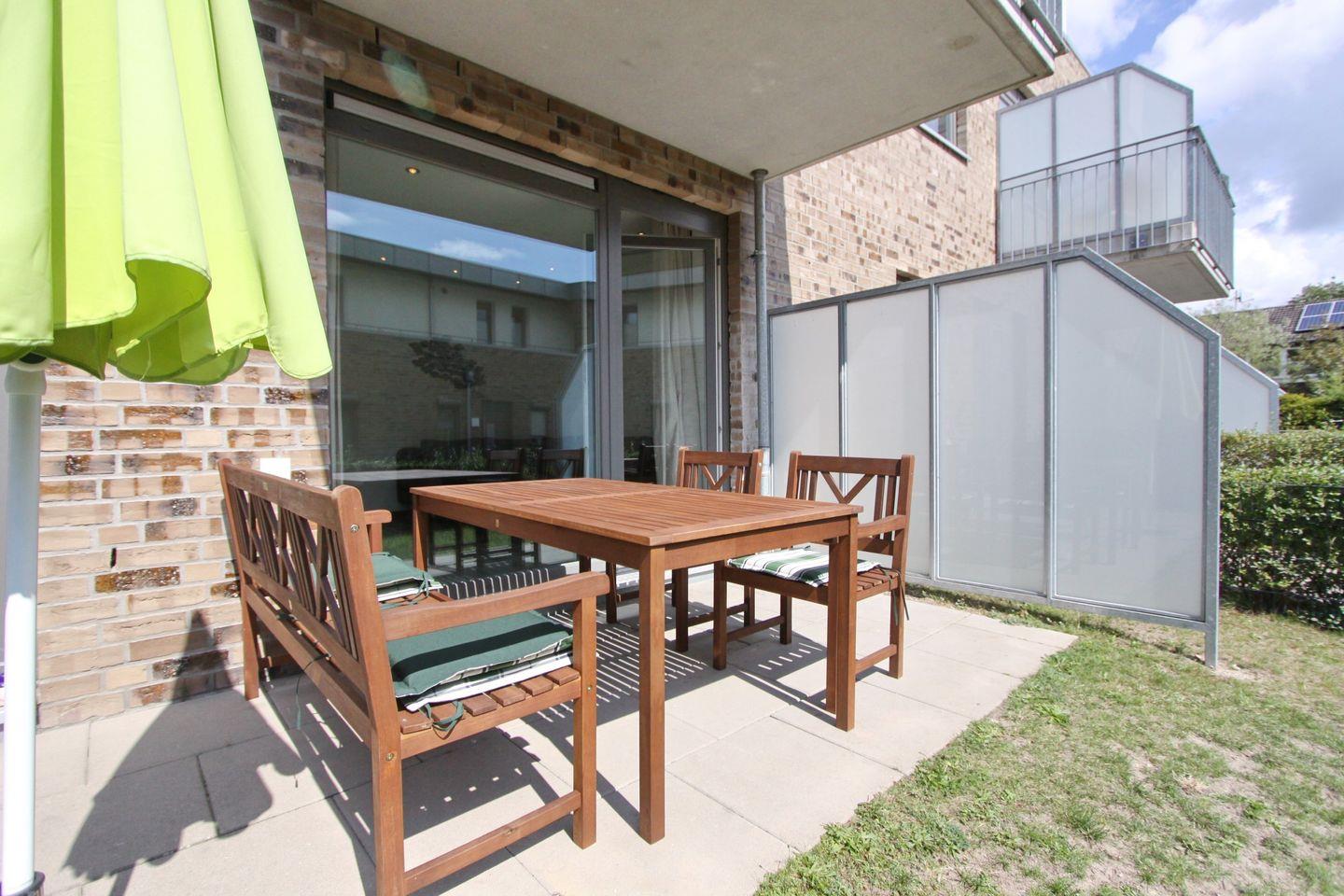 Großzügige und moderne Ferienwohnung im Erdgeschoss mit möblierter Terrasse und eingezäunten Garten in einer stilvoll angelegten Wohnanlage.
