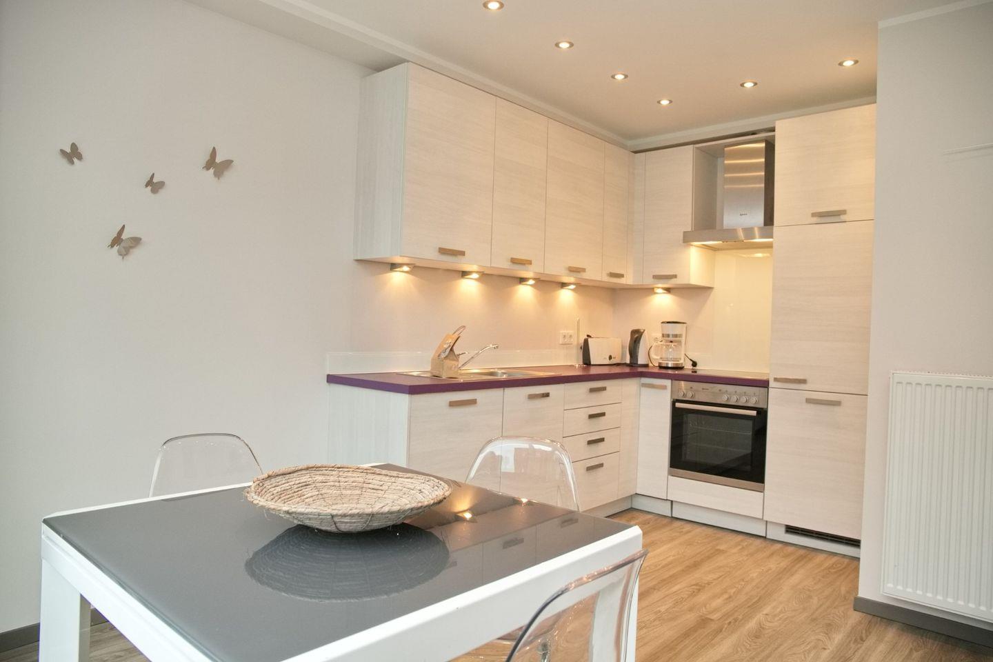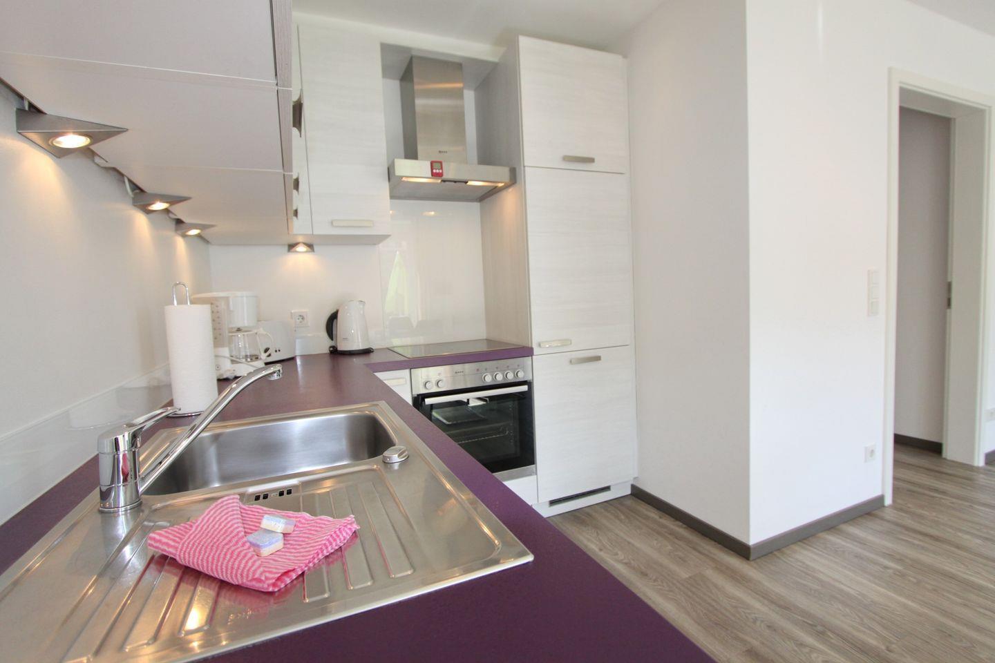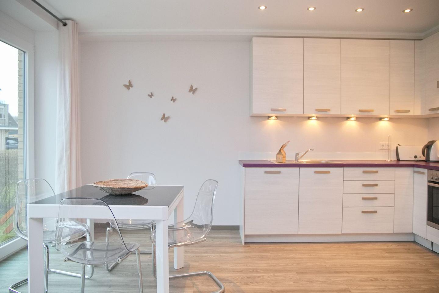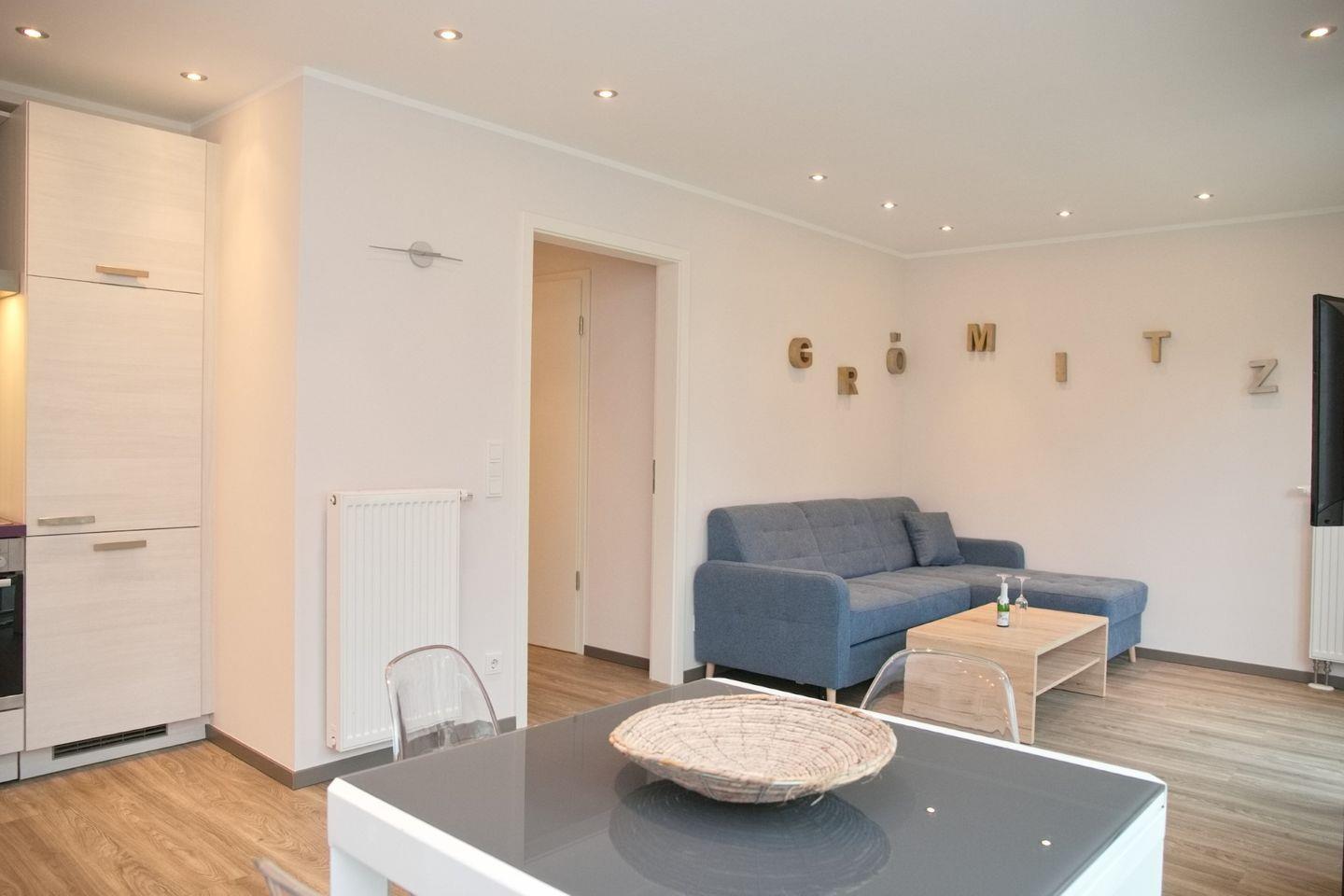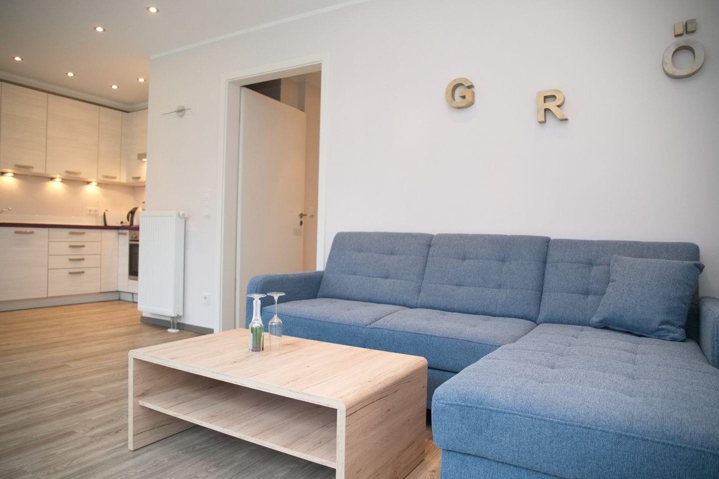 Das in Natur tönen gehaltene und mit Planken ausgelegten Wohnzimmer verfügt über eine gemütliche Eckcouch, einen Flach-TV,einen Essbereich für 4 Personen sowie die offene Einbauküche. Die schicke Küche ist ausgestattet mit einem Cerankochfeld, eine Dunstabzugshaube, einem Backofen, einem Kühlschrank mit Gefrierfach, einem Geschirrspüler und einer Kombi-Kaffeemaschine/Wasserkocher/Toaster.