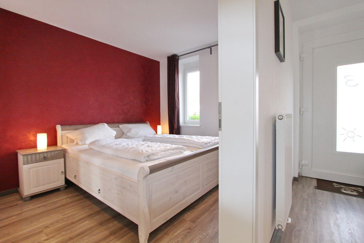 Ein Doppelbett mit Nachtische und einen Kleiderschrank finden Sie im Schlafzimmer. Hier passt zwischen dem Bett und dem Kleiderschrank ein Kinderreisebett.