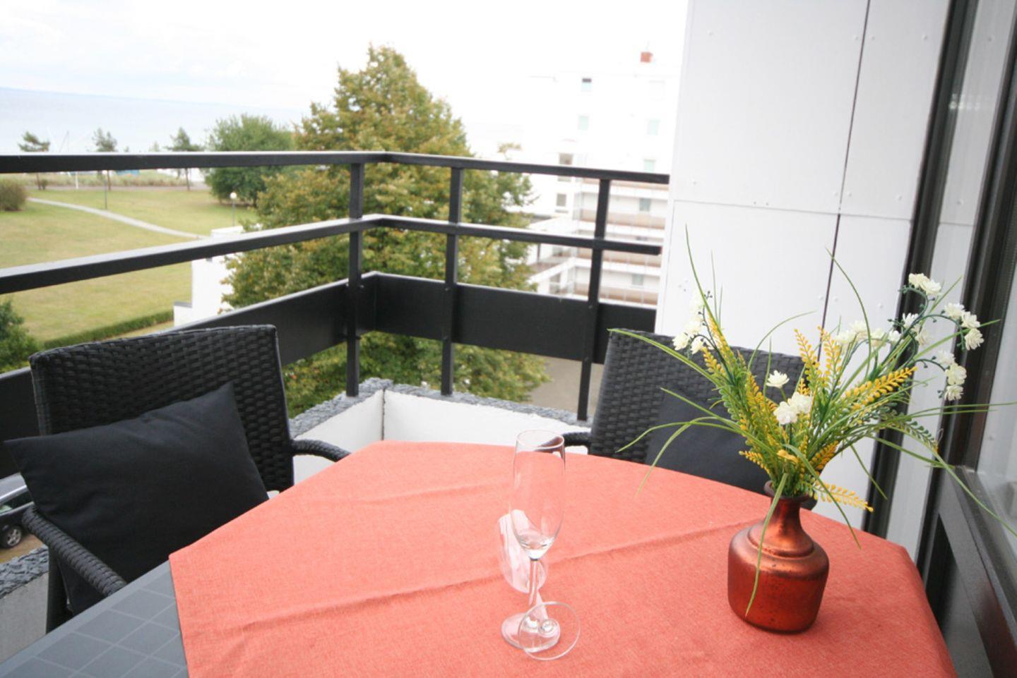 Charmante 2-Zimmer-Ferienwohnung mit möbliertem Südbalkon und Teilseeblick, nur 200 m vom Strand in Grömitz entfernt.