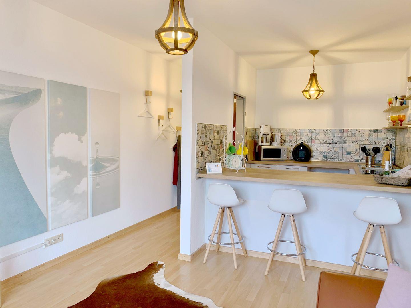 Die Wohnung befindet sich im ersten Stock eines gepflegten Gebäudes und ist bequem mit dem Aufzug erreichbar. Der offene Wohn- und Essbereich lädt dazu ein, gemeinsame Stunden zu verbringen. Hier können Sie gemütliche Abende auf dem Sofa verbringen oder einen Film auf dem TV genießen. Die moderne Küche ist vollständig ausgestattet und bietet alles, was Sie brauchen, um sich selbst zu versorgen. Sie finden hier einen Kühlschrank, einen Cerankochfeldherd, einen Backofen, eine Spülmaschine sowie eine Kaffeemaschine und weitere nützliche Küchengeräte. Ob ein schnelles Frühstück oder ein üppiges Abendessen – Ihrer Kreativität sind keine Grenzen gesetzt.