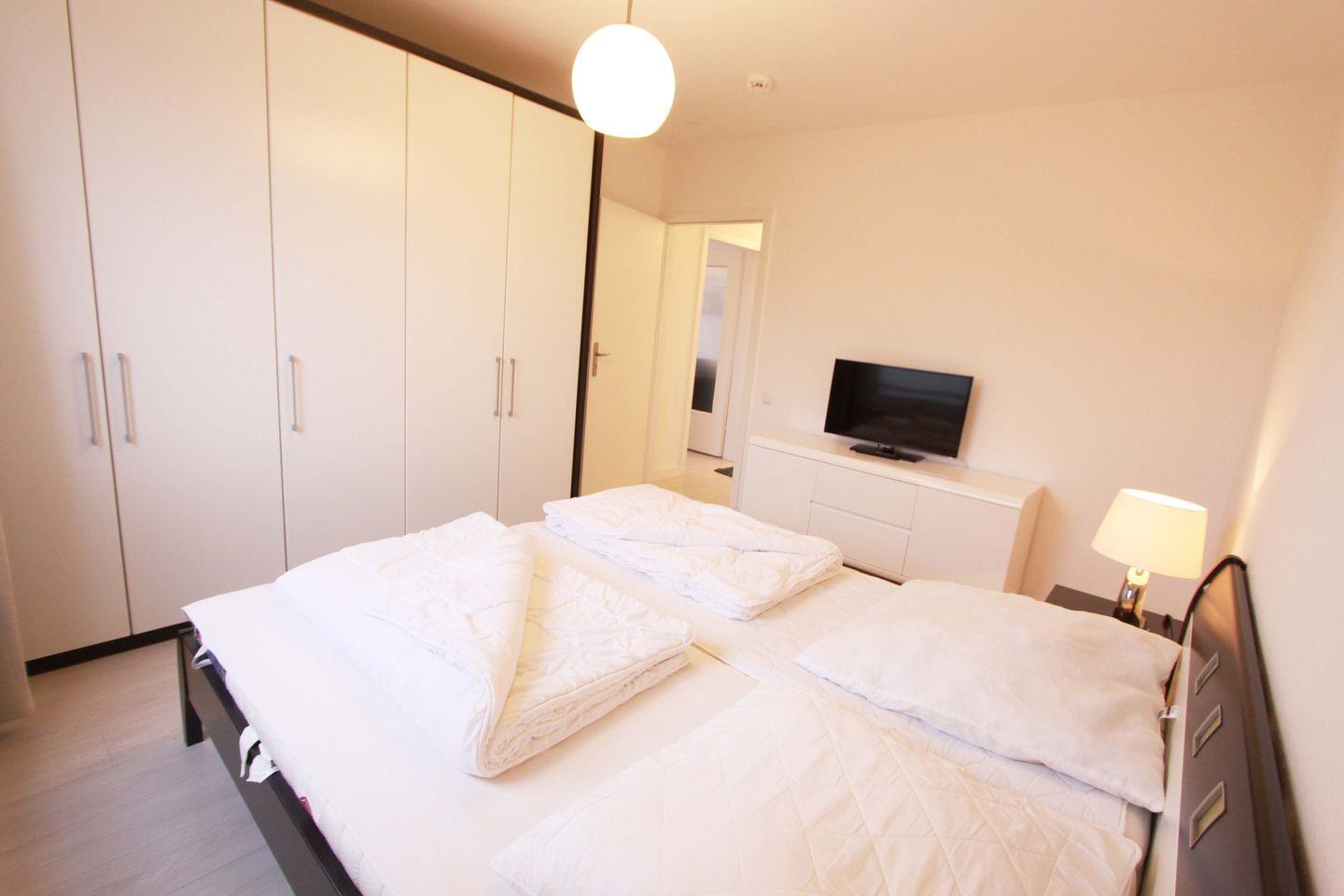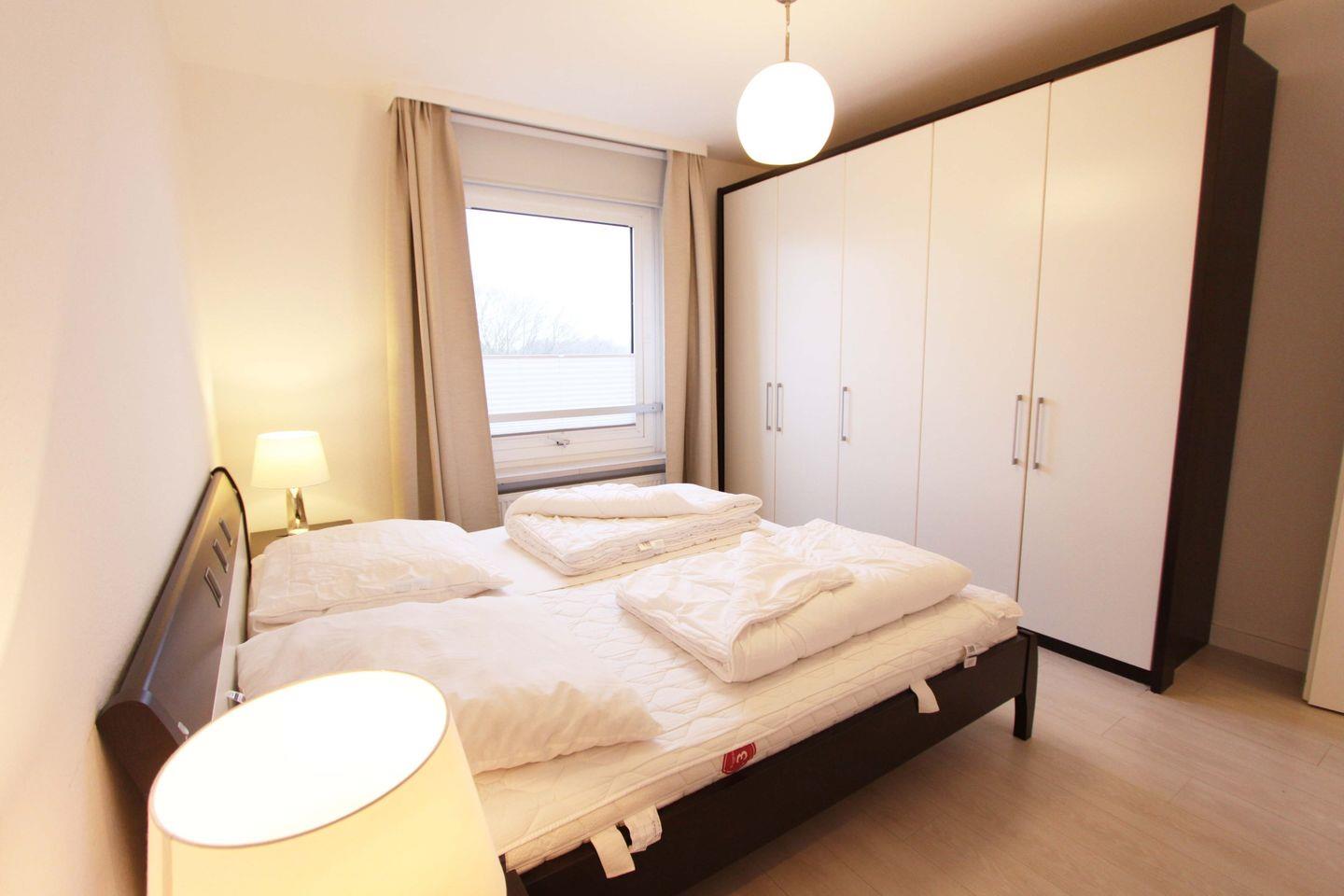 Geradeaus über den Flur gelangen Sie in das Schlafzimmer. Dieses verfügt über ein Doppelbett (2x90x200 cm), großen Kleiderschrank und eine Kommode mit Flach TV. Genießen Sie schon morgens nach dem Aufstehen den herrlichen Blick auf die tosende See.