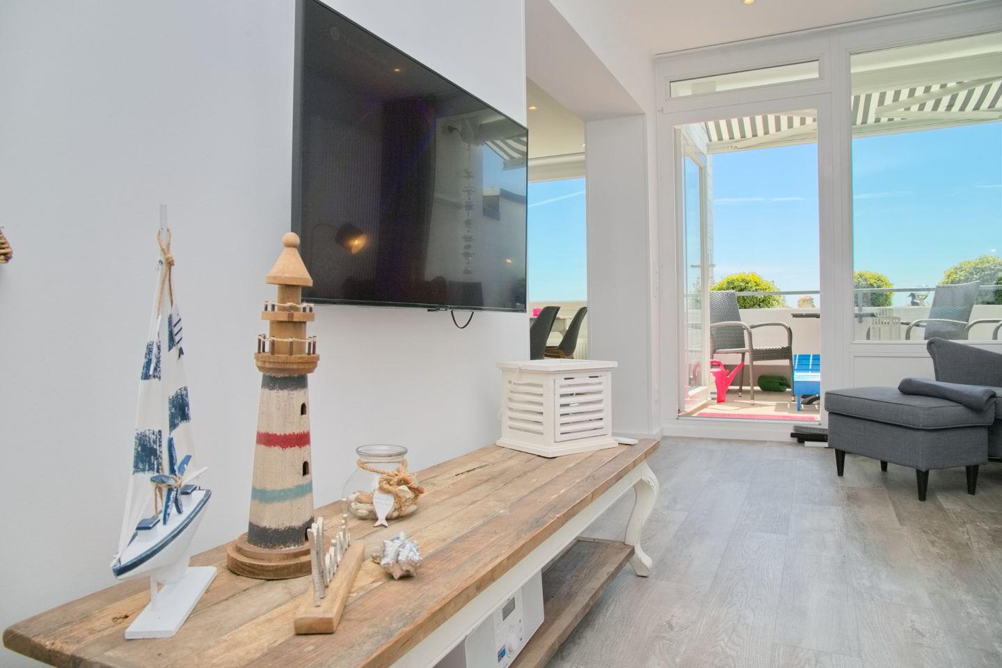 Beim Betreten der Wohnung wirst du sofort von einer luftigen und offenen Atmosphäre empfangen. Der Wohnbereich ist großzügig gestaltet und mit hochwertigen Möbeln im maritimen Design ausgestattet. Große Panoramafenster ermöglichen einen unverbauten Blick auf das Meer und lassen viel natürliches Licht hereinströmen. Hier kannst du gemütliche Abende verbringen und die Wellen beobachten.