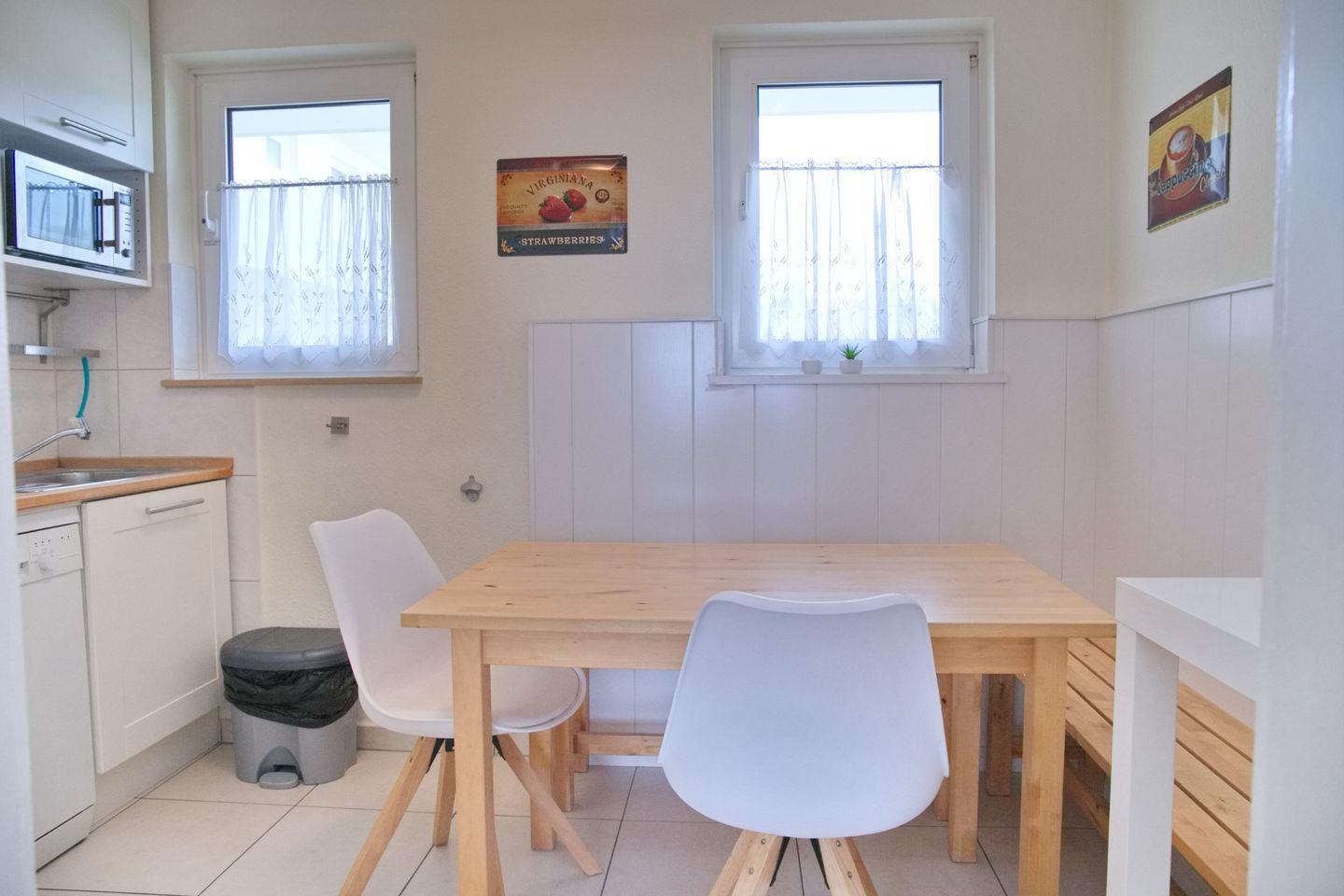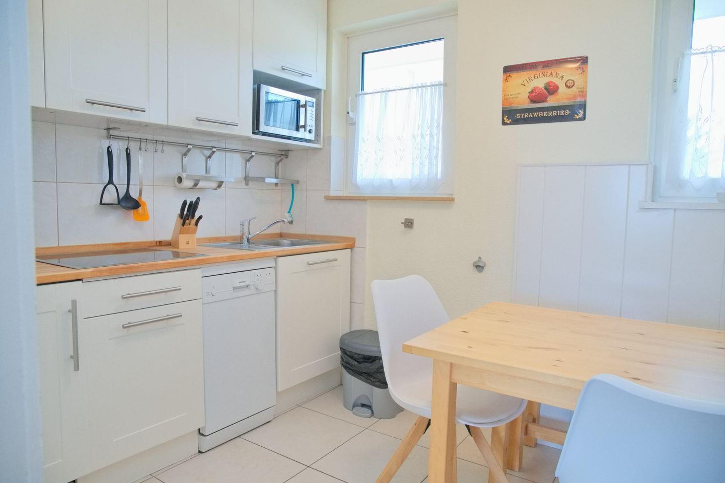 In der Küche gibt es einen Geschirrspüler, Ceranfeld, Kühlschrank, Mikrowelle, Kaffeemaschine, Wasserkocher, Toaster sowie einen Essbereich für 4 Personen. Die Wohnung für max. 4 Personen ist mit Laminat ausgelegt.