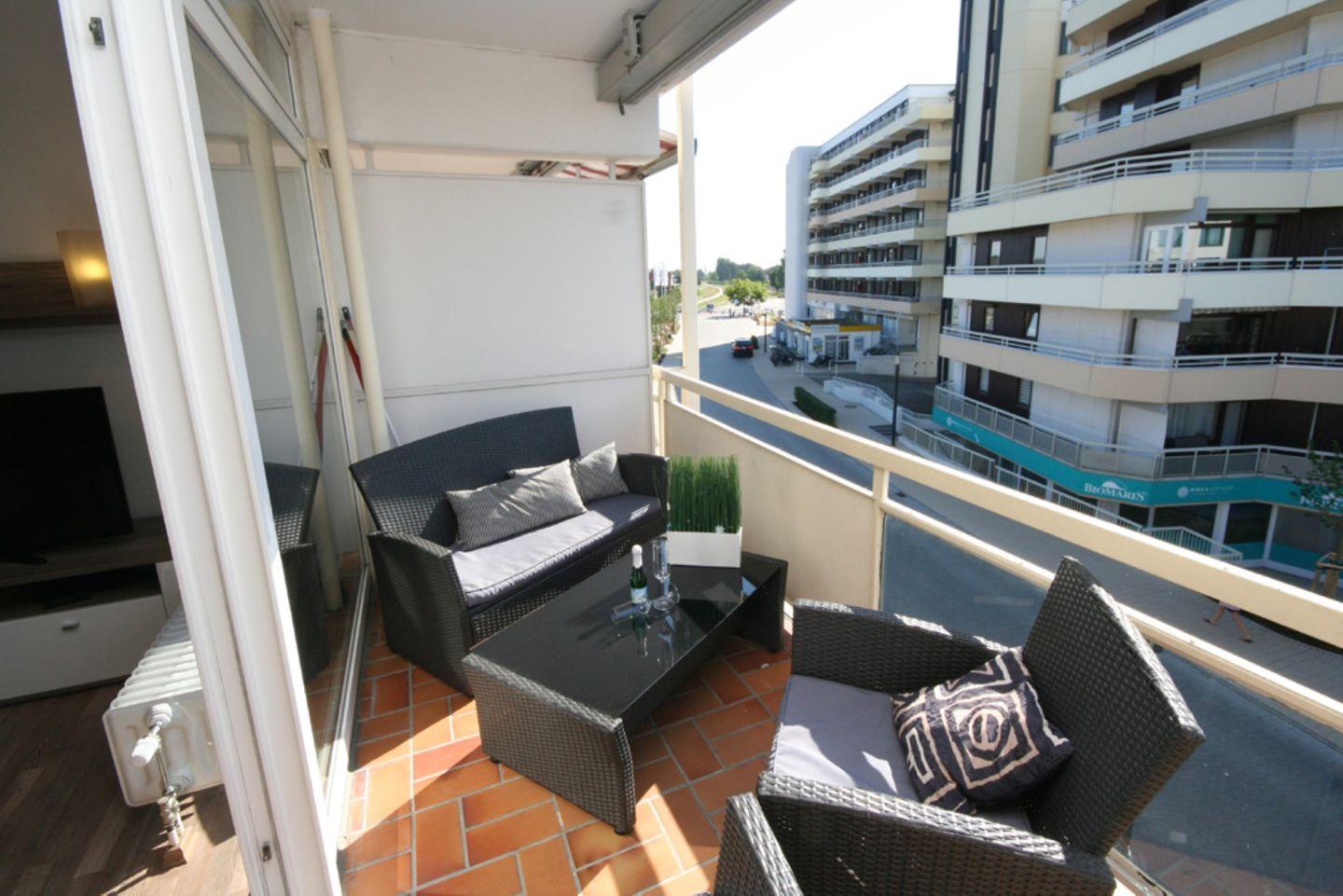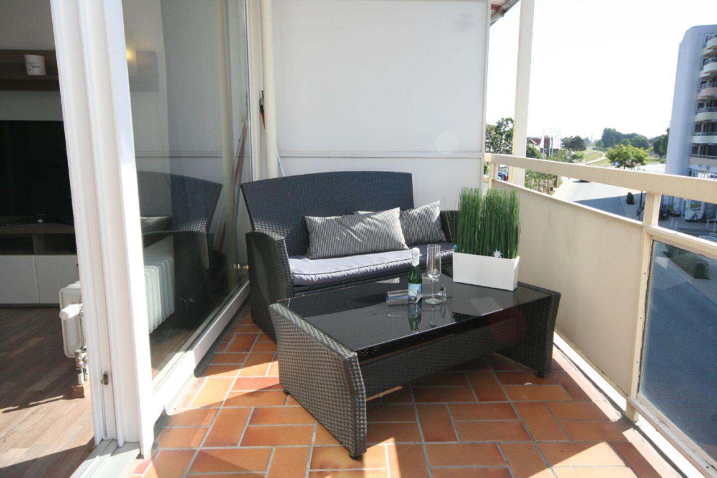 Zurück ins Wohnzimmer haben Sie Zugang zum Balkon mit Südausrichtung und Blick zum Meer. Hier lassen sich die Sommerabende traumhaft ausklingen.