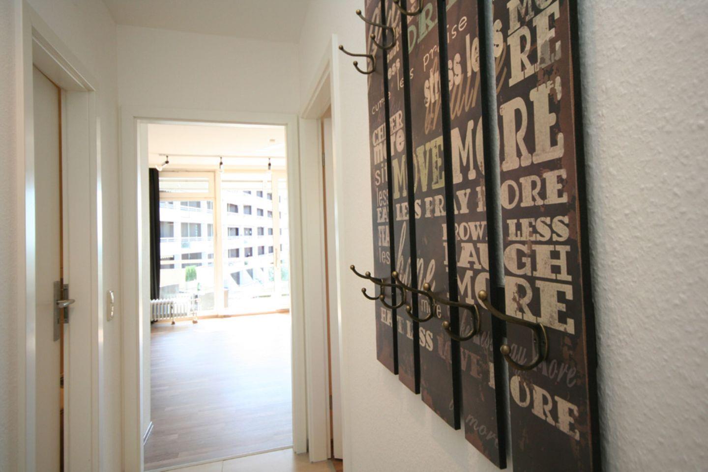 Nach betreten der Wohnung gelangen Sie über den Flur in das Wohnzimmer. Dank der großen Fensterfront haben Sie hier einen hellen Raum mit Blick richtung Meer. Der Wohnbereich ist mit einer Schlafcouch und einem Sessel eingerichtet. Zur Unterhaltung stehen Ihnen hier ein Flachbild TV und eine Stereoanlage mit USB bereit. Der Essbereich findet hier auch seinen Platz.