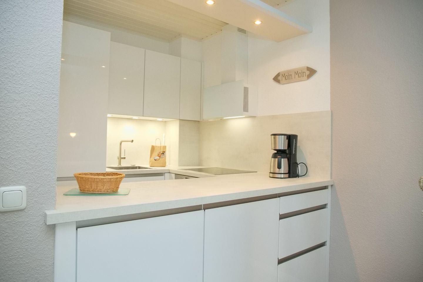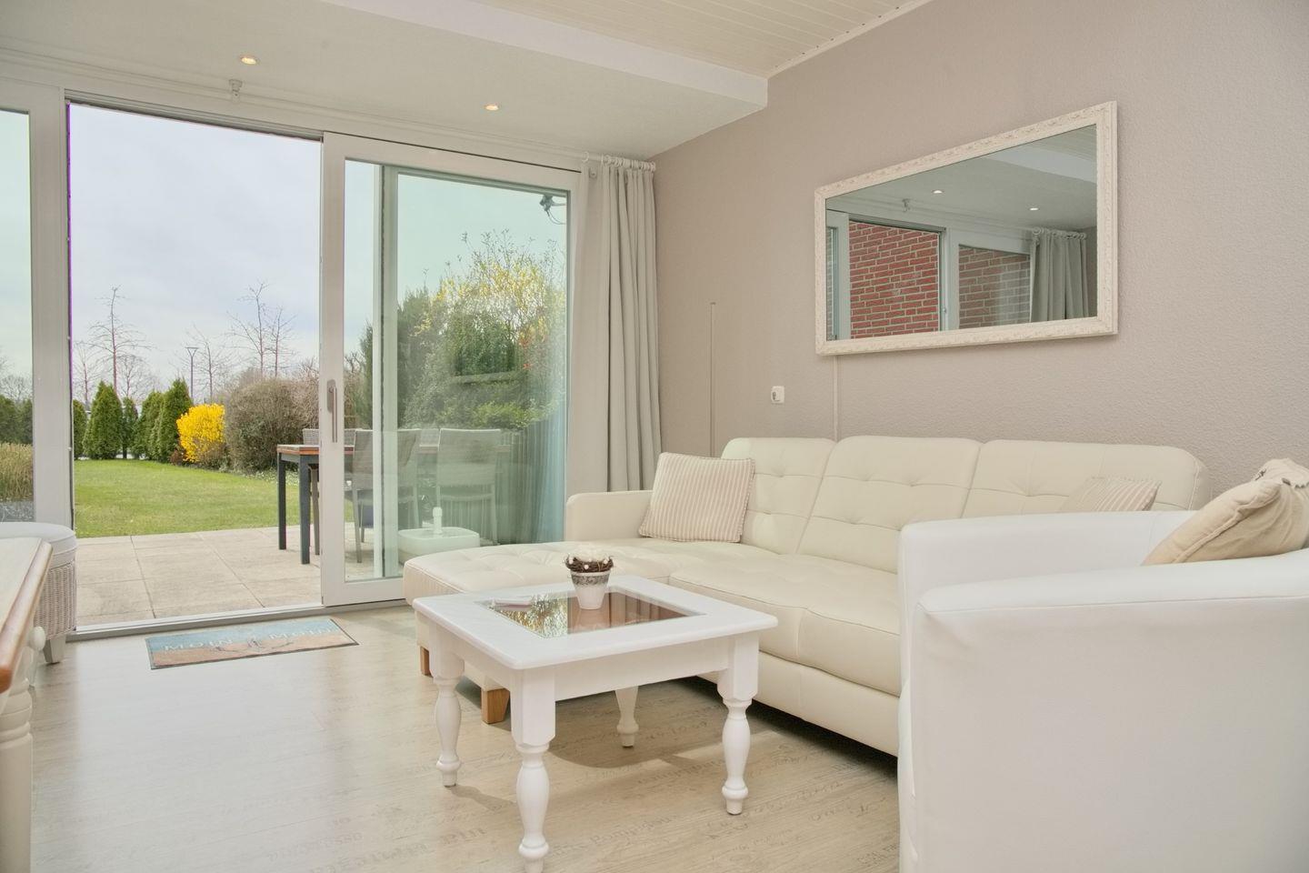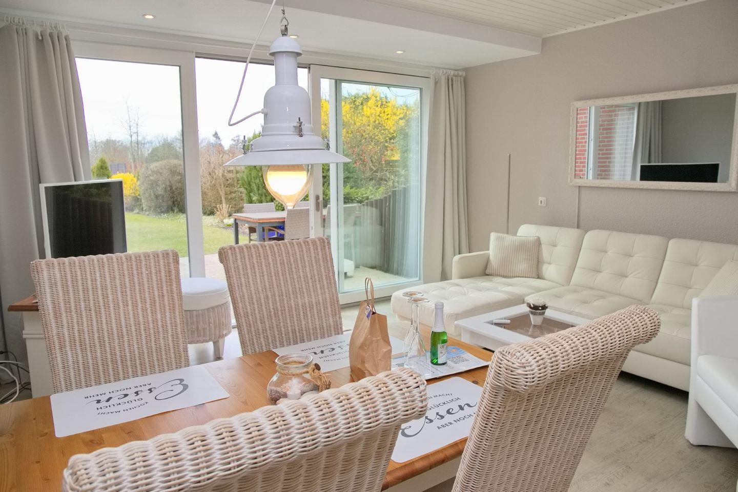 Der große Wohnraum ist dank des großen Terrassenelemts hell und mit einem einheitlichen Farbkonzept sehr geschmackvoll eingerichtet. Von der Couch haben Sie einen direkten Blick auf den Garten und in die Küche. Die moderne Küchenzeile bietet genug Platz, um ein gemeinsames Frühstück oder ein leckeres Dinner zuzubereiten.