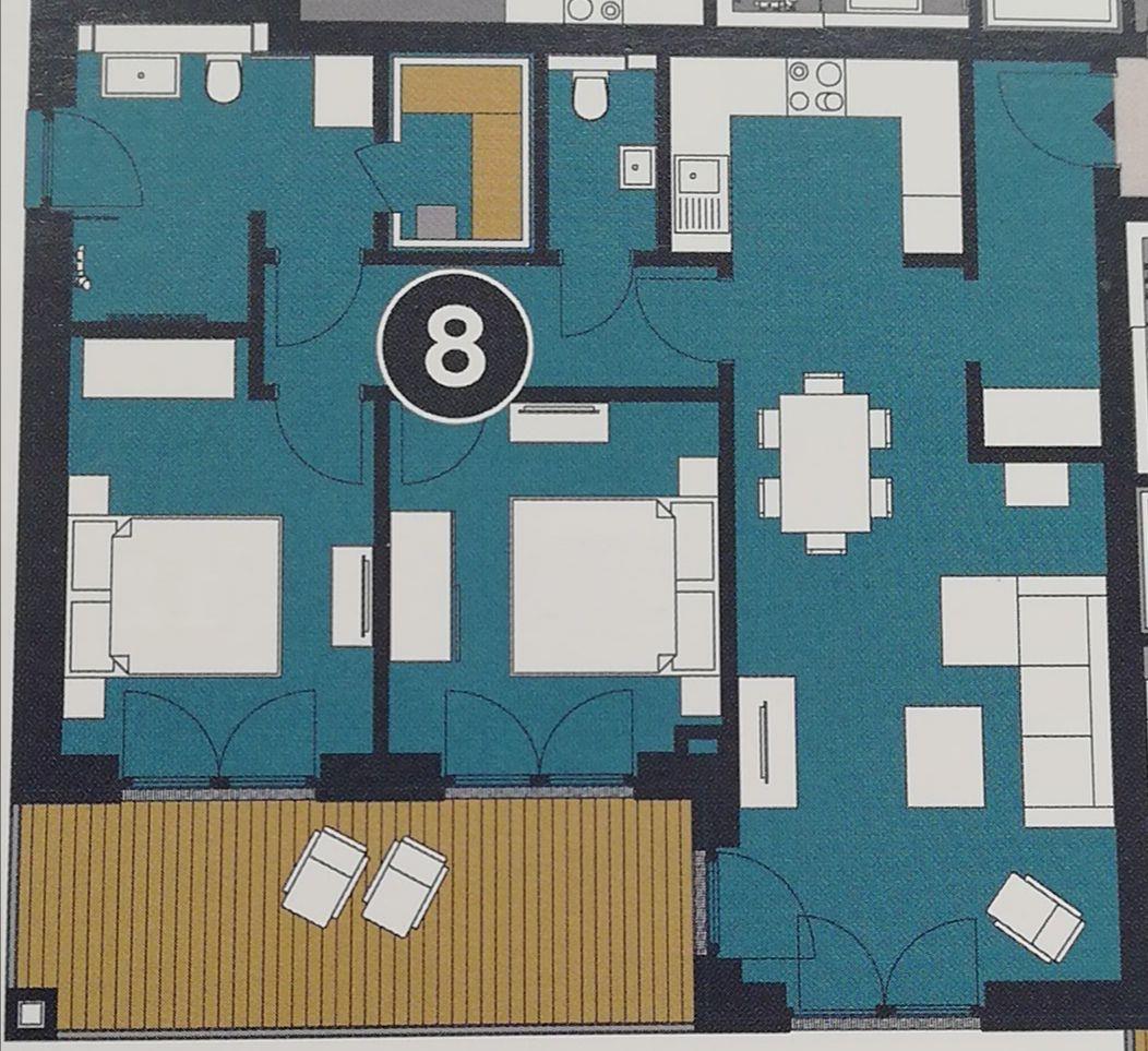 Auf gleicher Ebene befinden sich zwei lichtdurchflutete Schlafzimmer mit Boxspringbett(180x200 cm durchgehender Topper), Schiebetürenkleiderschrank und Flatscreen-TV. Von beiden Schlafzimmern sowie vom Wohnzimmer haben Sie Zugang zum überdachten Balkon. Im Bad erwartet Sie eine bodengleiche Dusche mit WC, Waschtisch und eigener Sauna. Ein Gäste- WC finden Sie ebenfalls vor.