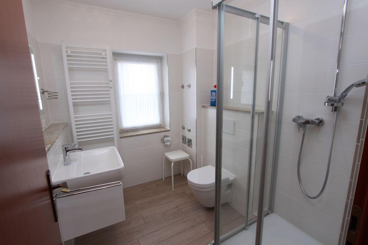 Zu Ihrer Rechten kommen Sie direkt in das moderne, helle Duschbad mit WC, Waschtisch und Außenfenster.