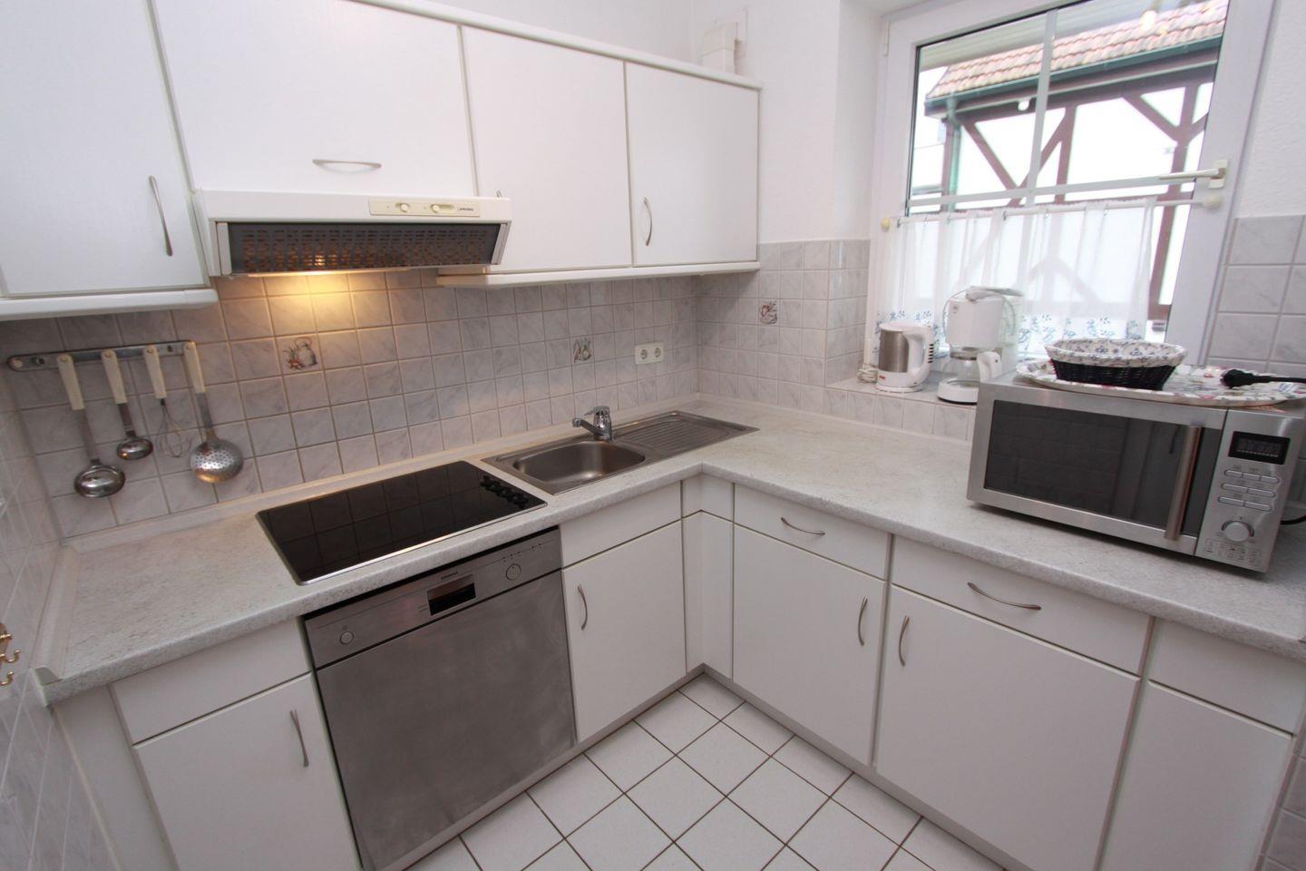 Hier finden Sie eine Eckcouchgarnitur mit Massagefunktion, einen Sessel, ein doppeltes Schrankbett und einen weiteren Flach TV, sowie eine Stereoanlage. Der Essbereich findet im Erker seinen Platz. Von dem Wohnbereich gelangen Sie in die Einbauküche. Diese verfügt über ein Cerankochfeld mit Dunstabzugshaube, Mikrowelle mit Grillfunktion, einen Geschirrspüler, einen Kühlschrank mit Gefrierfach, einen Wasserkocher, einen Toaster und einer Kaffeemaschine.