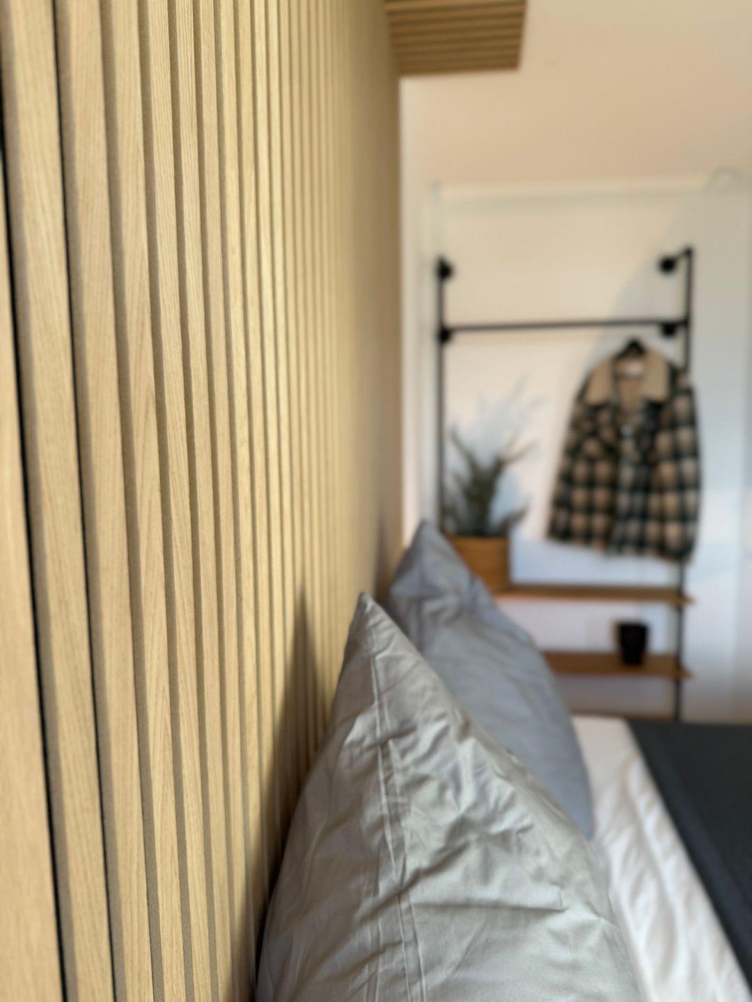 Die moderne Rückwand aus Akustikpanelen sorgt für einen ruhigen Schlaf.