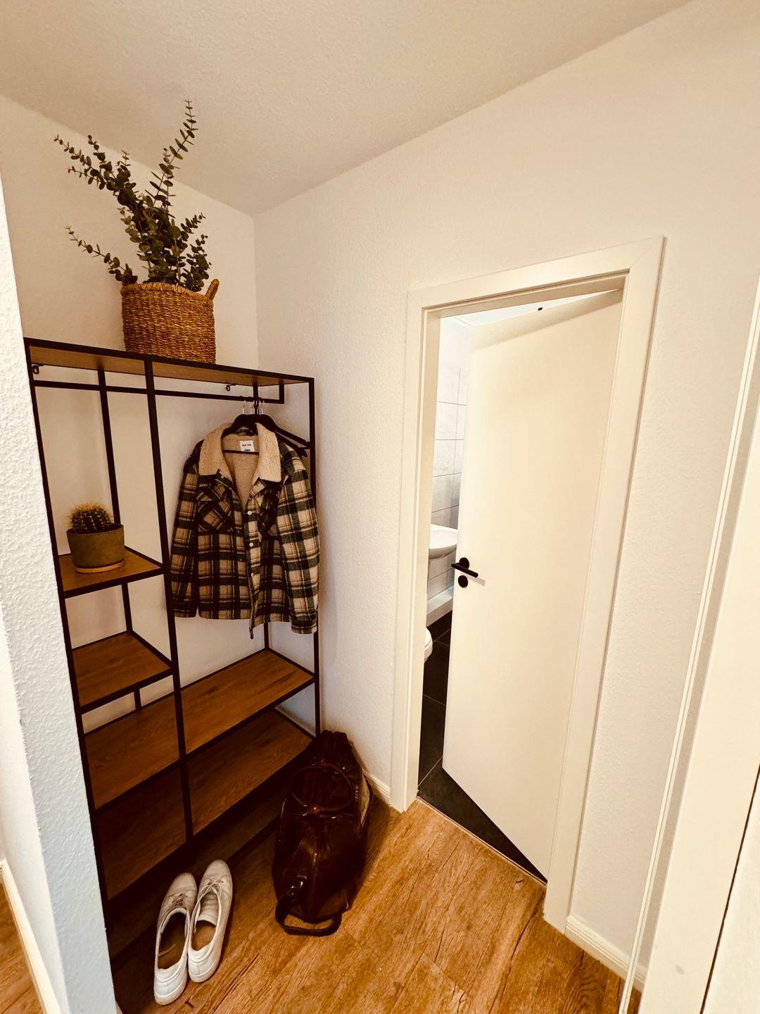 Mit dem Fahrstuhl gelangen Sie bequem direkt zu Ihrer Wohnung. Beim Betreten erwartet Sie ein einladender Flur mit Garderobe und Spiegel, die den perfekten Startpunkt für Ihre Urlaubserlebnisse bildet.